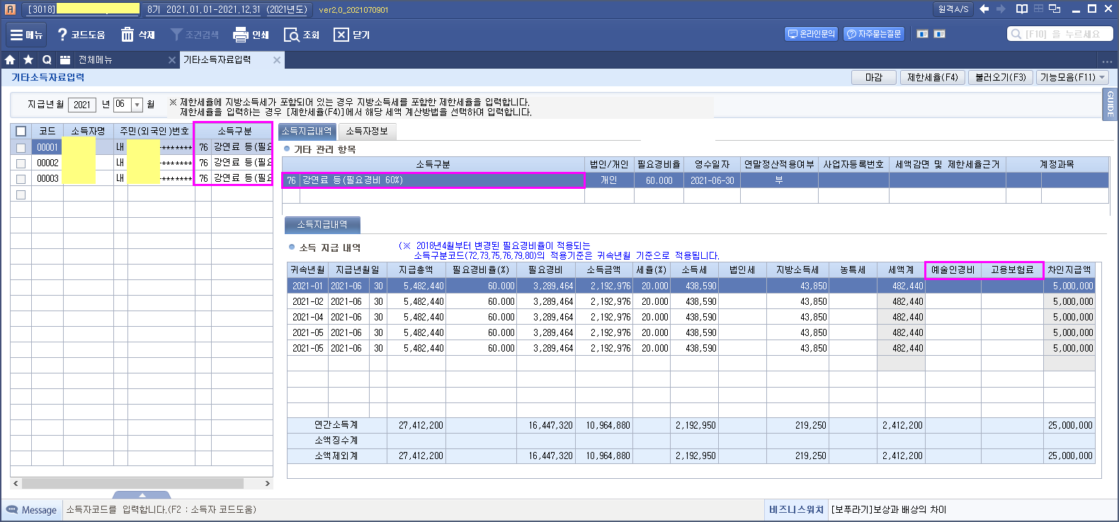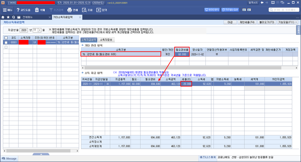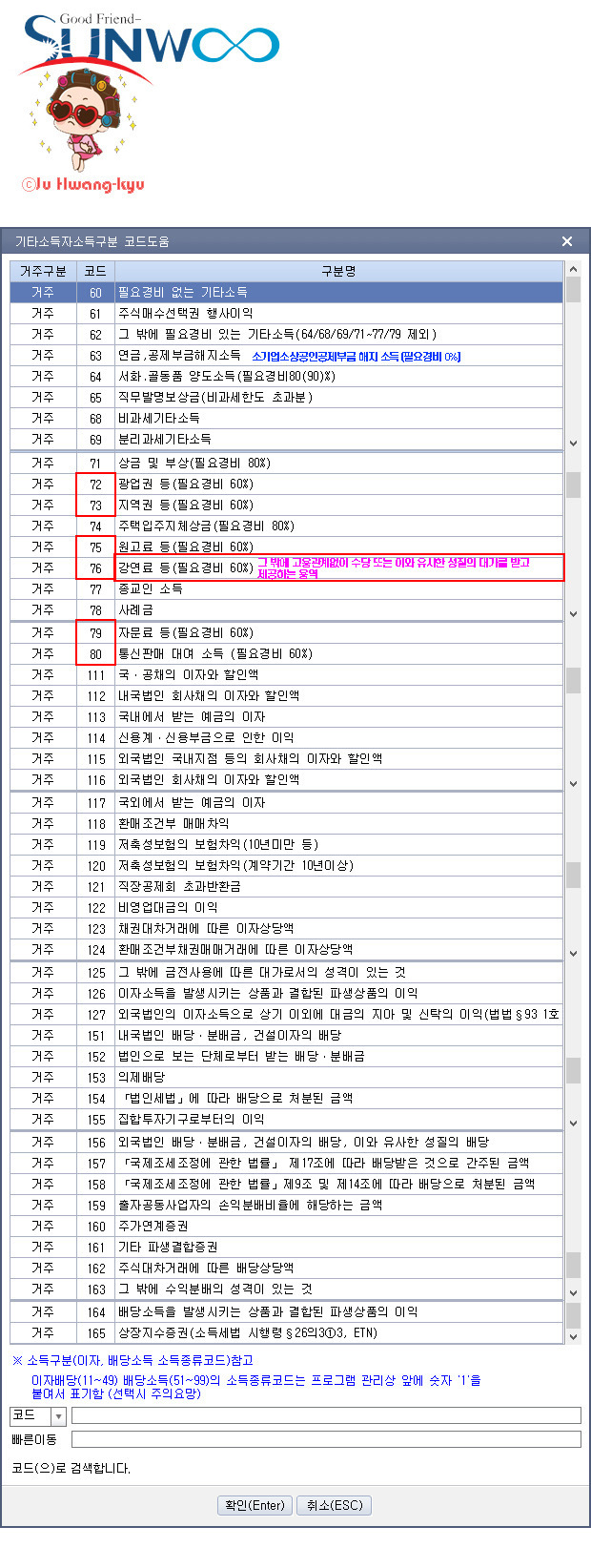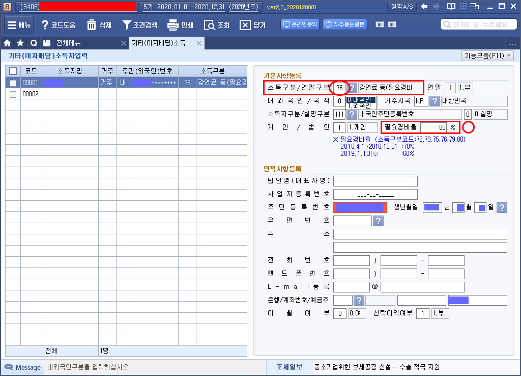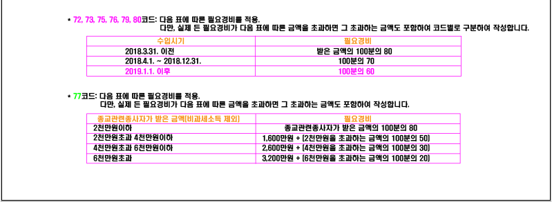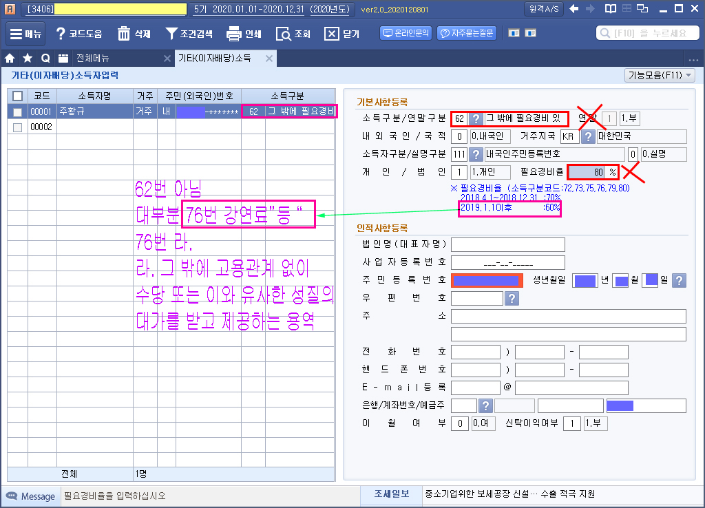 엑셀 기타소득대장 2019.01.01일 이후 기타소득(지급액 직접법으로 8.8% 원천징수) 필요경비율 60% -> 76 강연료