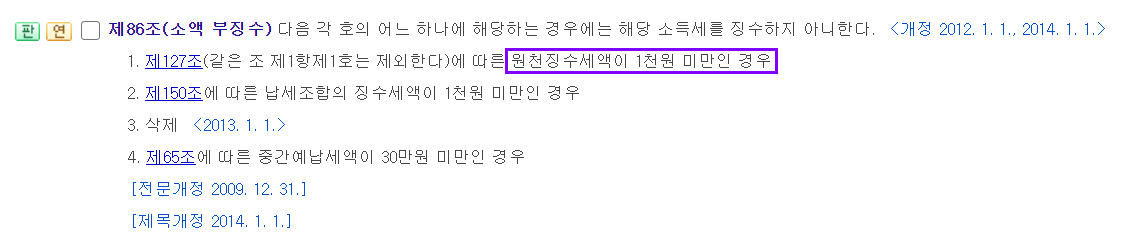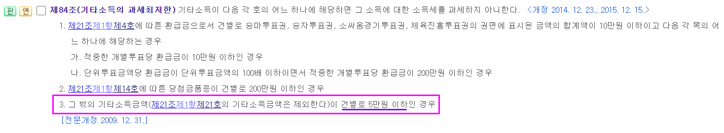 3. 그 밖의 기타소득금액(제21조(기타소득) 제1항 제21호의 기타소득금액은 제외한다)이 건별로 5만원 이하인 경우(2014.12.23 개정)