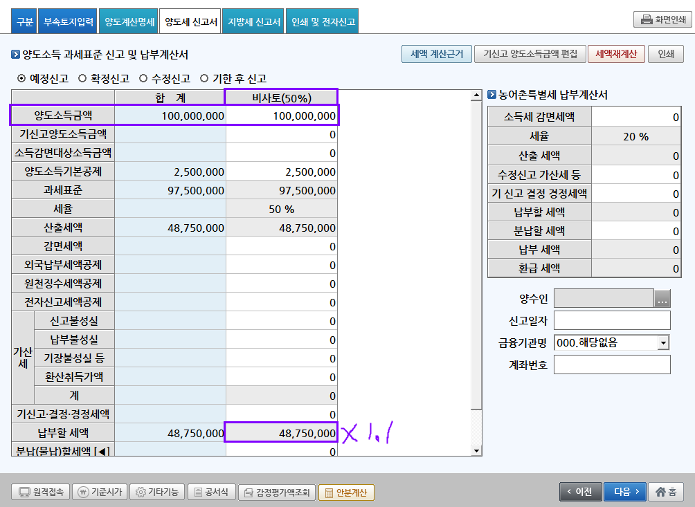 취등록세 , 양도소득세 48,750,000 + 지방소득세 4,875,000 = 53,625,000원