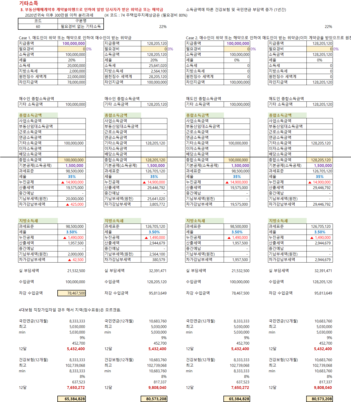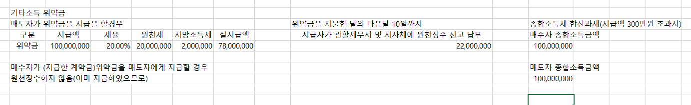 계약금이 위약금 · 배상금으로 대체되는 기타소득이 있는 경우 (개산필요경비 0%,실제필요경비(실무상 없음)) 지급액의 22%원천징수