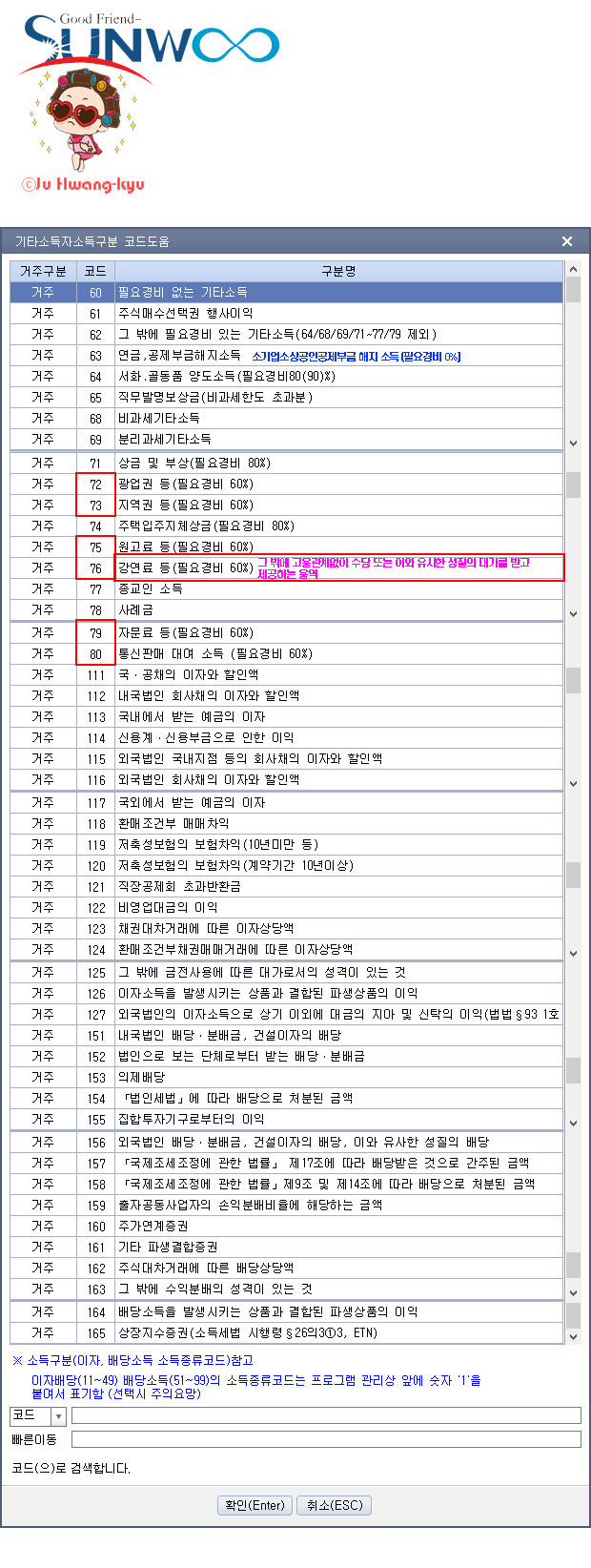 | 기타소득금액=총수입금액-(총수입금액×80/100) |
