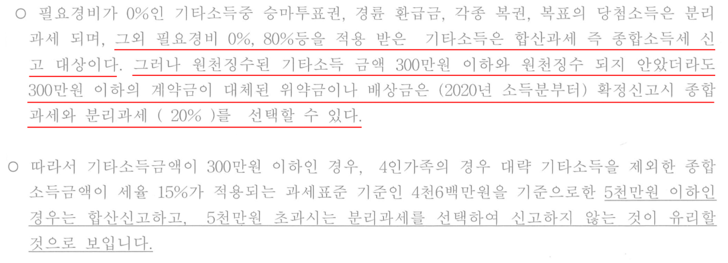다음 중 하나에 해당하는 기타소득은 다음 과세기간 5월 종합소득세신고시 종합소득과세표준에 합산하여 신고하여야 한다.