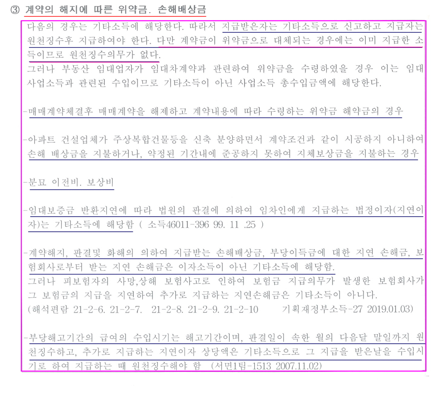 | ① 기타소득은 이자소득ㆍ배당소득ㆍ사업소득ㆍ근로소득ㆍ연금소득ㆍ퇴직소득·금융투자소득 및 양도소득 외의 소득으로서 다음 각 호에서 규정하는 것으로 한다.(2020.12.29 개정) 10. 계약의 위약 또는 해약으로 인하여 받는 소득으로서 다음 각 목의 어느 하나에 해당하는 것(2014.12.23 개정) 가. 위약금(2014.12.23 신설) 나. 배상금(2014.12.23 신설) 다. 부당이득 반환 시 지급받는 이자(2014.12.23 신설) |