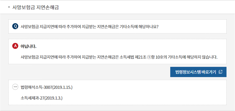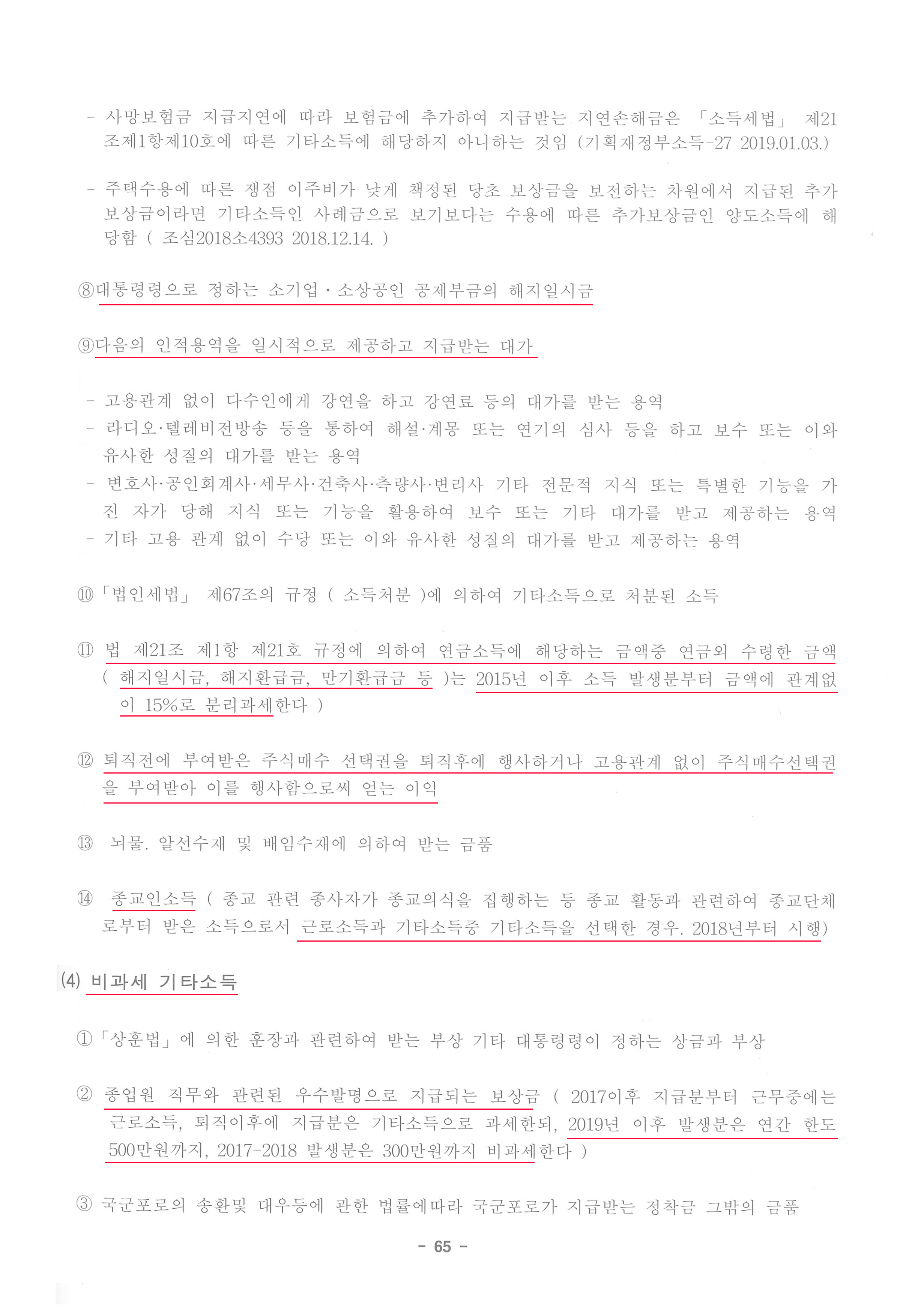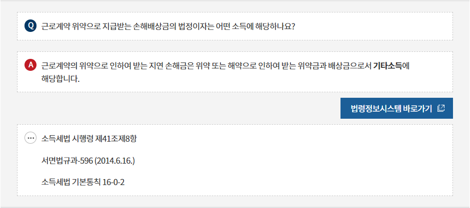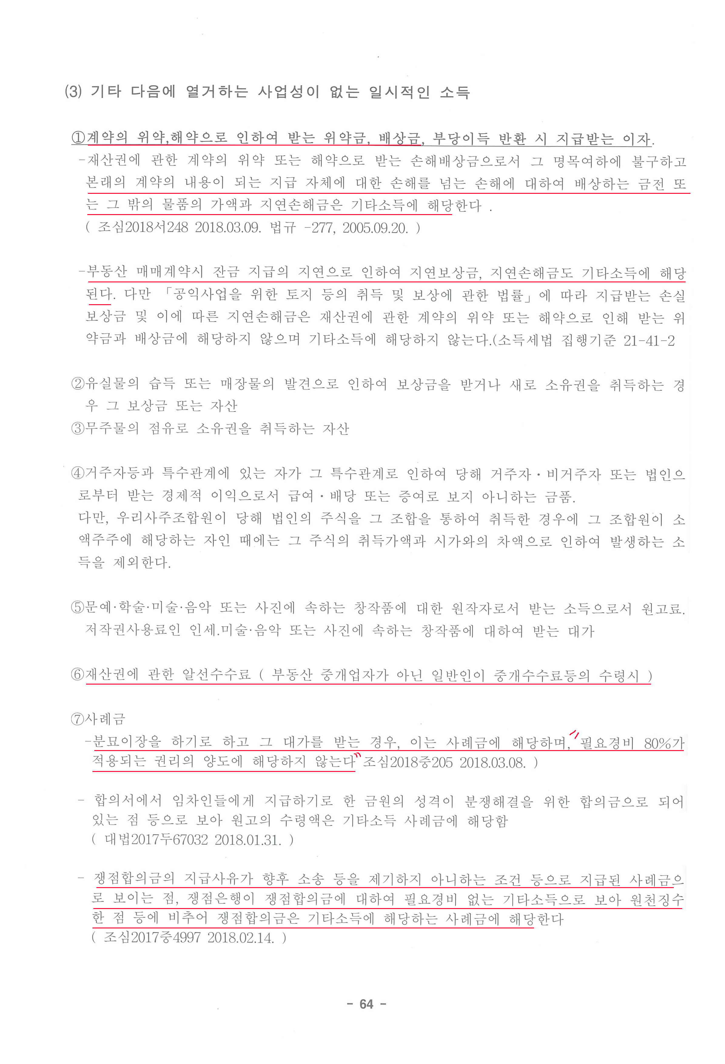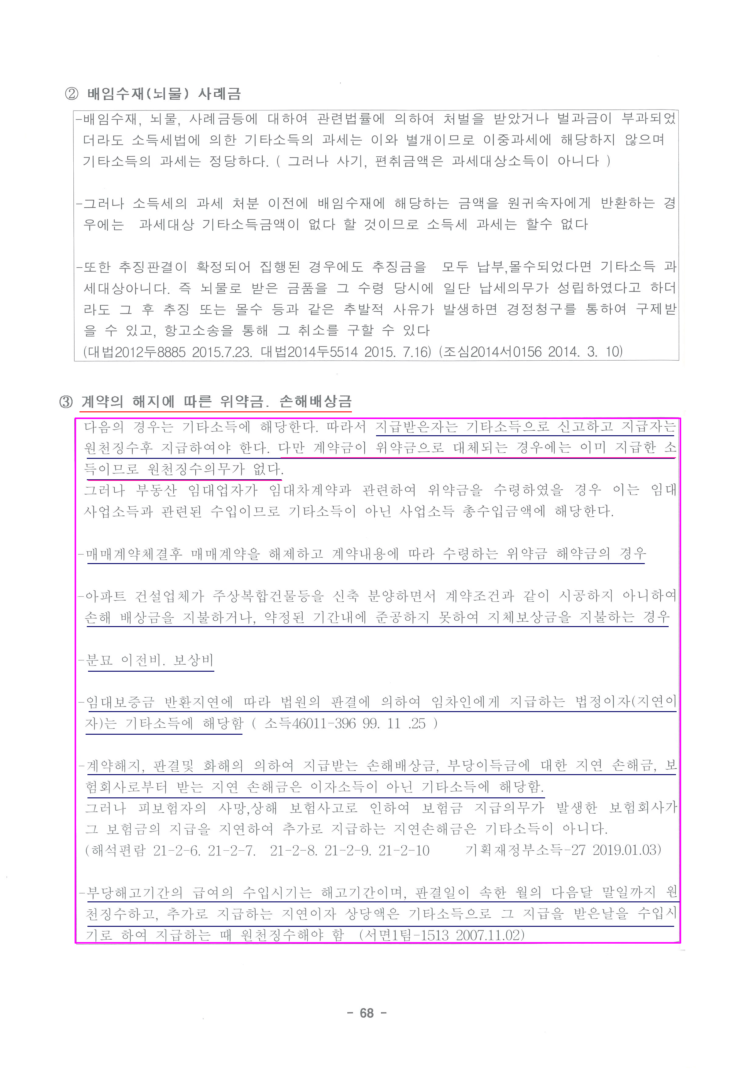 | ① 기타소득은 이자소득ㆍ배당소득ㆍ사업소득ㆍ근로소득ㆍ연금소득ㆍ퇴직소득·금융투자소득 및 양도소득 외의 소득으로서 다음 각 호에서 규정하는 것으로 한다.(2020.12.29. 개정) 10. 계약의 위약 또는 해약으로 인하여 받는 소득으로서 다음 각 목의 어느 하나에 해당하는 것(2014.12.23 개정) 가. 위약금(2014.12.23 신설) 나. 배상금(2014.12.23 신설) 다. 부당이득 반환 시 지급받는 이자(2014.12.23 신설) |