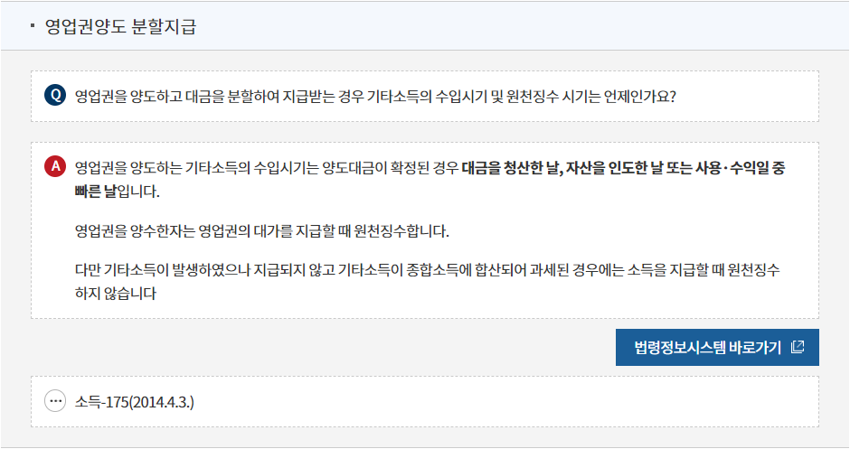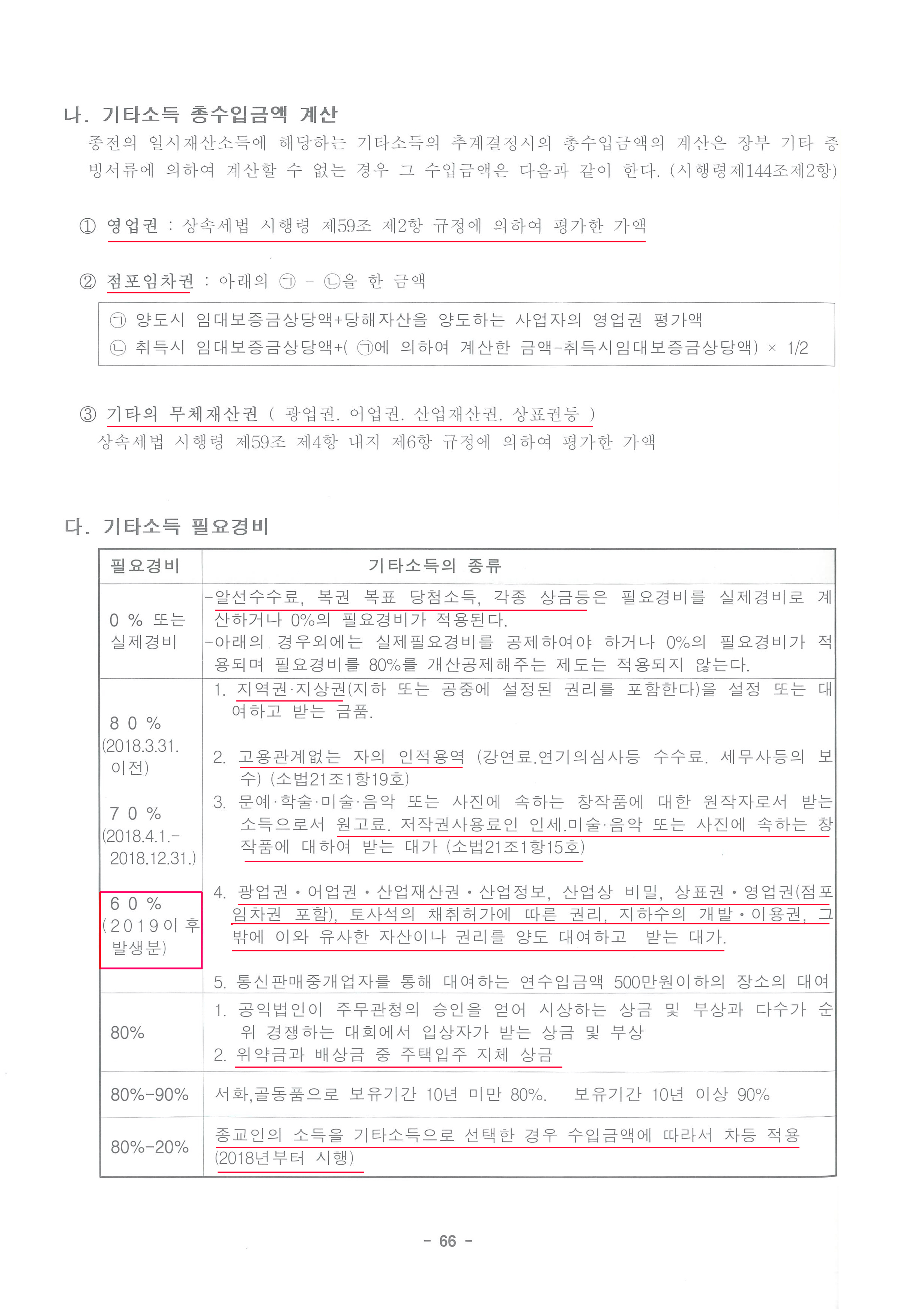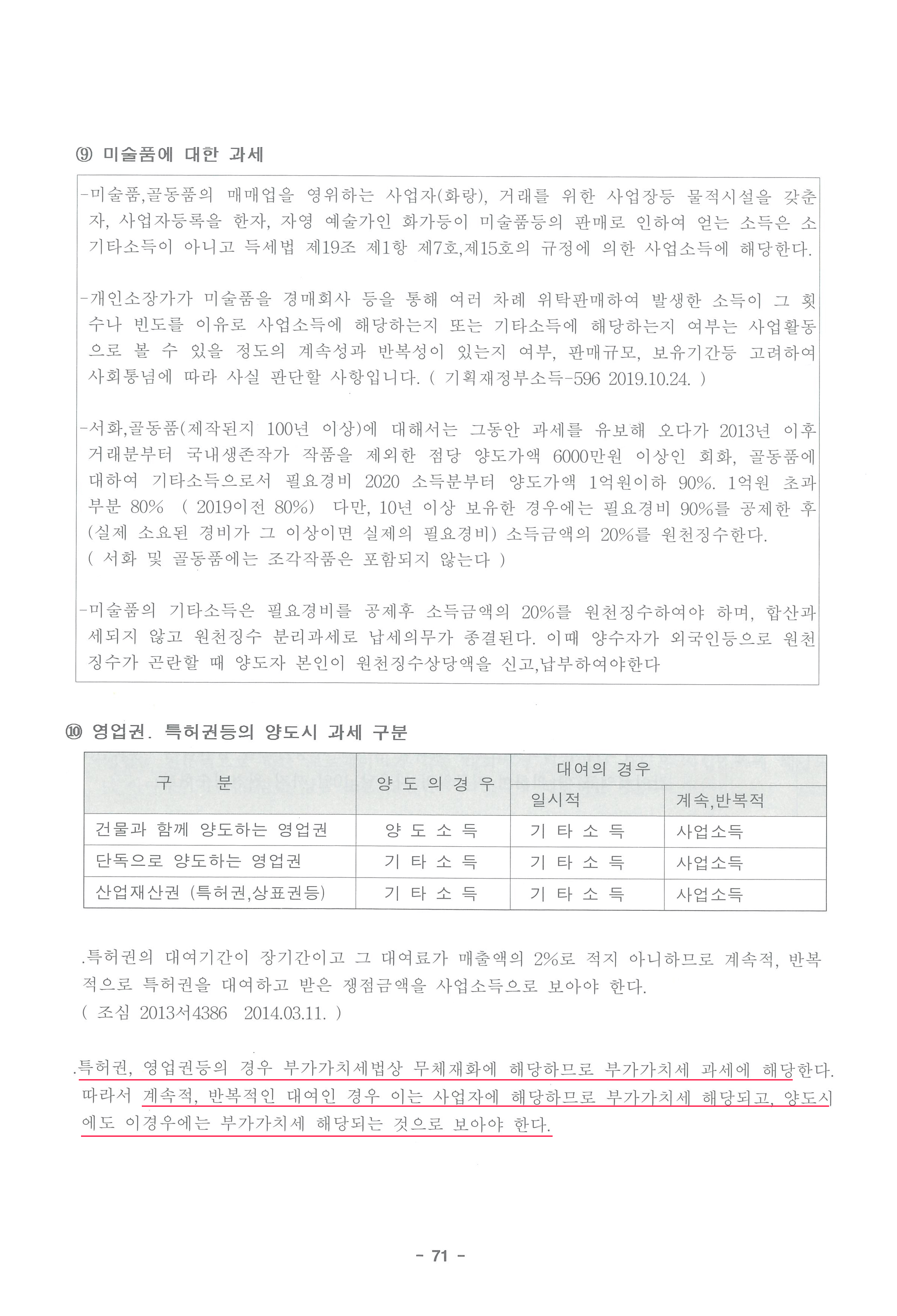 | ① 기타소득은 이자소득ㆍ배당소득ㆍ사업소득ㆍ근로소득ㆍ연금소득ㆍ퇴직소득·금융투자소득 및 양도소득 외의 소득으로서 다음 각 호에서 규정하는 것으로 한다.(2020.12.29. 개정) 7. 광업권ㆍ어업권ㆍ양식업권ㆍ산업재산권ㆍ산업정보, 산업상 비밀, 상표권ㆍ영업권(대통령령으로 정하는 점포 임차권을 포함한다), 토사석(土砂石)의 채취허가에 따른 권리, 지하수의 개발ㆍ이용권, 그 밖에 이와 유사한 자산이나 권리를 양도하거나 대여하고 그 대가로 받는 금품(2019.08.27 개정) |