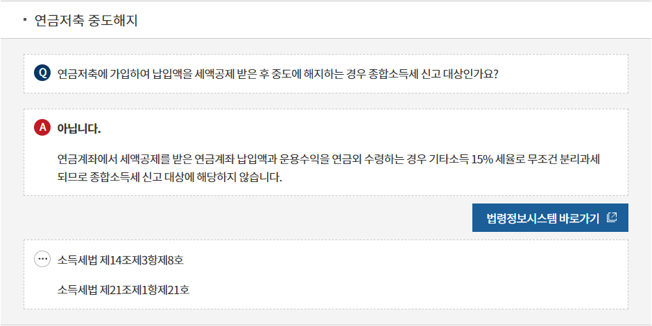 | ① 기타소득은 이자소득ㆍ배당소득ㆍ사업소득ㆍ근로소득ㆍ연금소득ㆍ퇴직소득·금융투자소득 및 양도소득 외의 소득으로서 다음 각 호에서 규정하는 것으로 한다.(2020.12.29. 개정) 21. 제20조의3 [ 연금소득 ] 제1항 제2호 나목 및 다목의 금액을 그 소득의 성격에도 불구하고 연금외수령한 소득(2013.01.01 개정) |