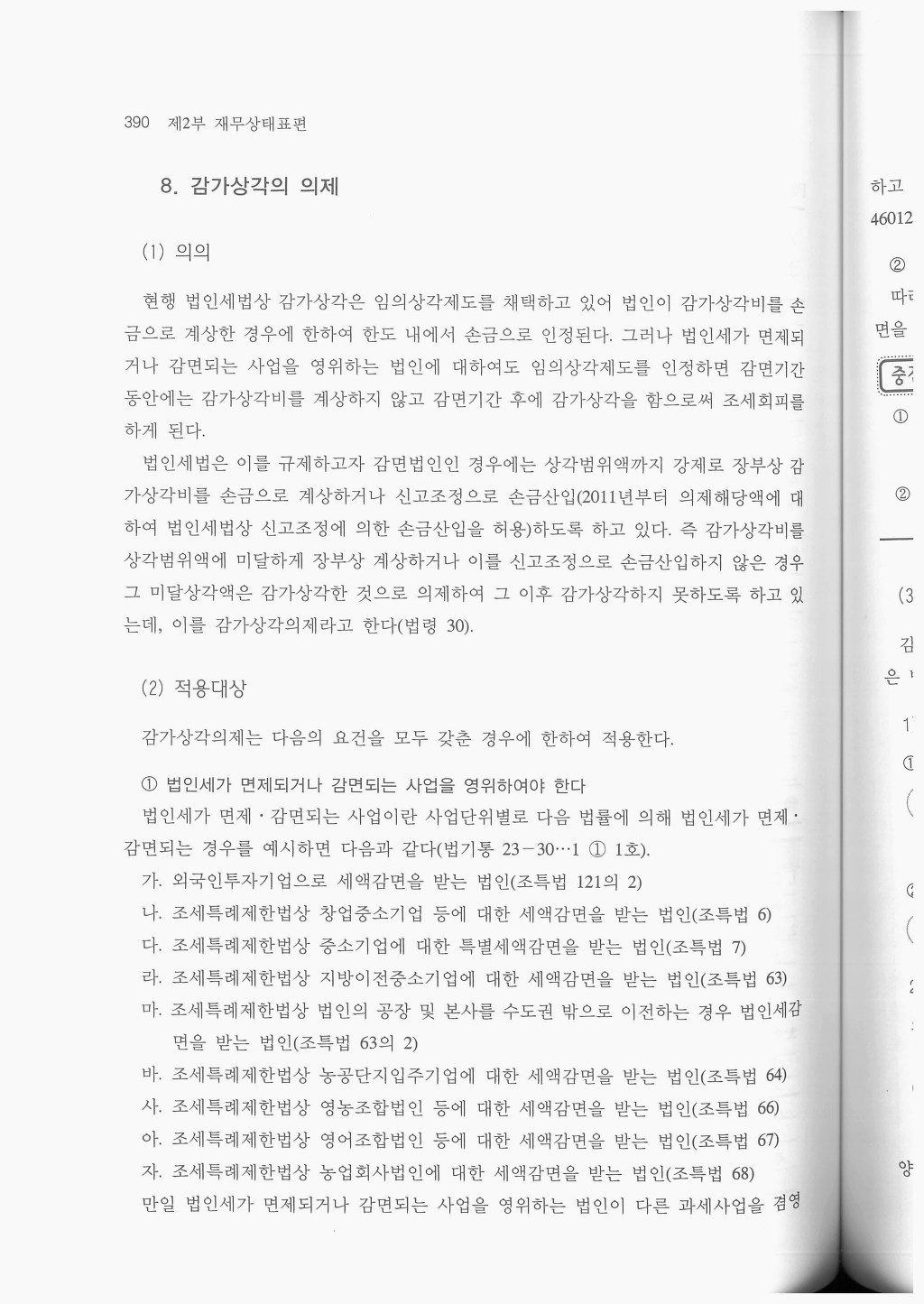| ① 각 사업연도의 소득에 대하여 법인세가 면제되거나 감면되는 사업을 영위하는 법인으로서 법인세를 면제받거나 감면받은 경우에는 법 제23조 제1항 및 제2항에 따라 손금에 산입하는 개별 자산에 대한 감가상각비가 상각범위액 이상이 되도록 감가상각비를 손금으로 계상하거나 손금에 산입하여야 한다.(2010.12.30 개정)