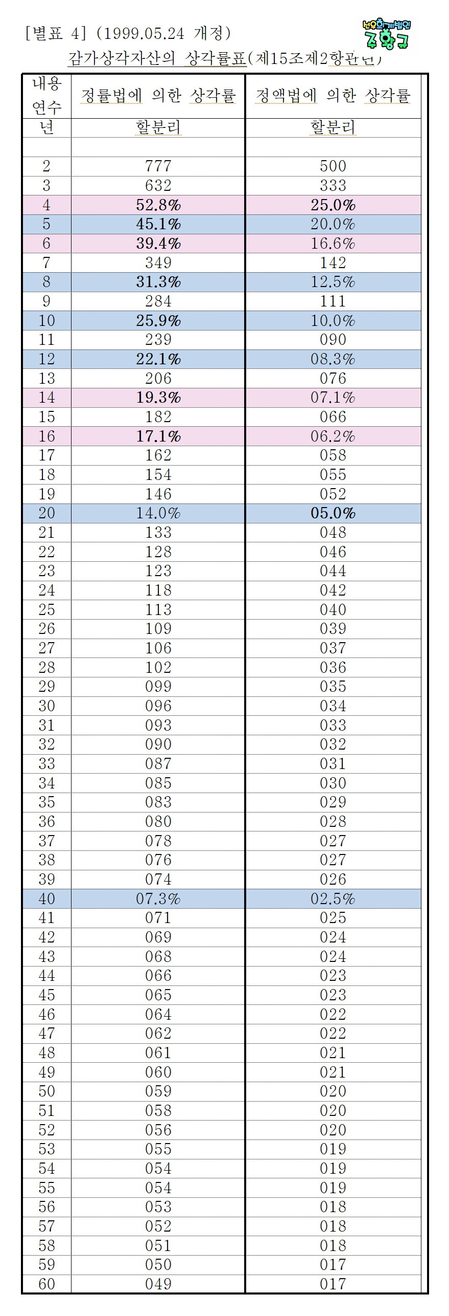 감가상각자산의 내용연수와 당해 내용연수에 따른 상각률은 다음 각 호에 따른다.(2016.02.12 개정)