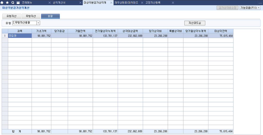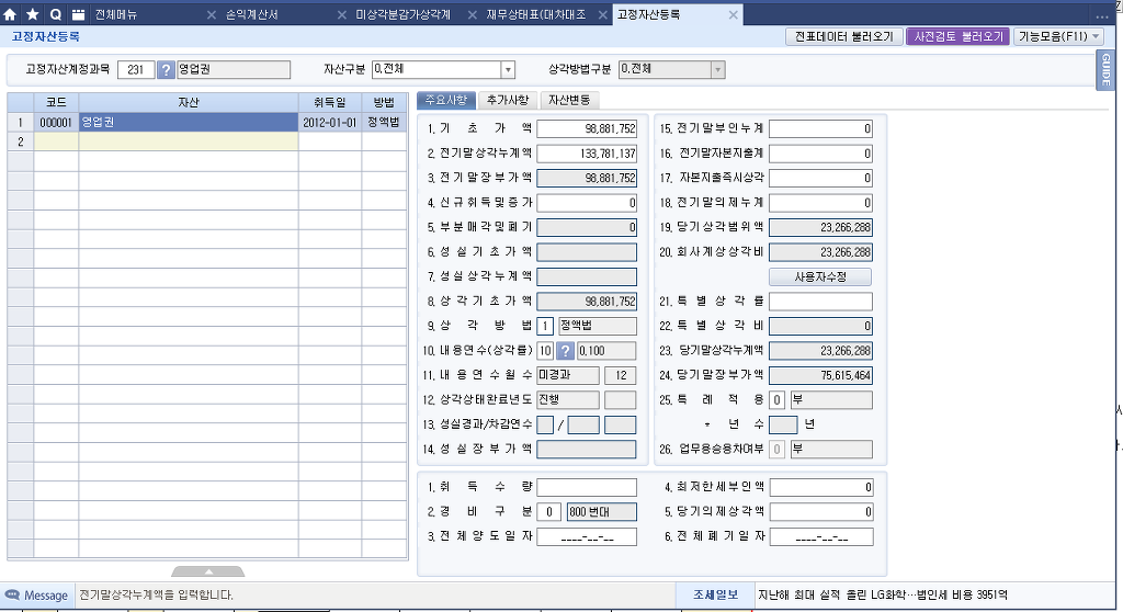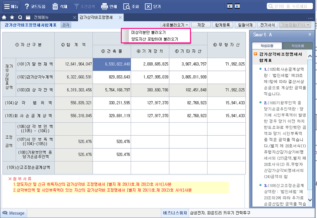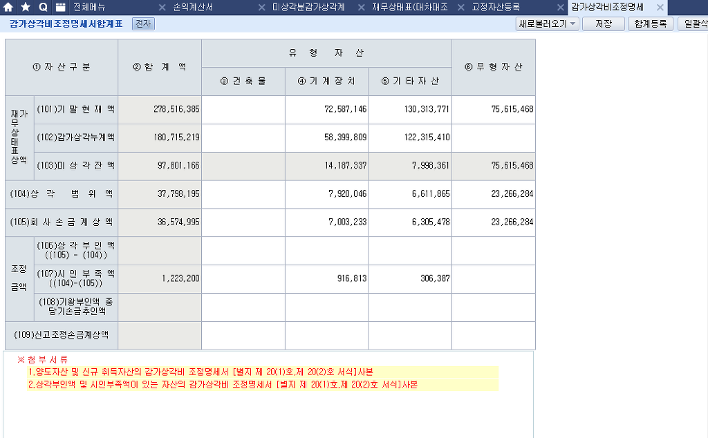 감가상각비 조정명세서 전체로 출력 전체로 미리보기해서 전기부인누계액에 맞는지 (전기 자본금과 적립금(을) 기말잔액) check!!