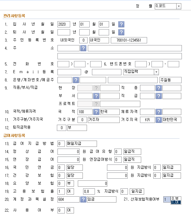 ・ 근로자별로 산재보험과 고용보험 적용구분에 체크하여야 합니다. - 산재ㆍ고용 모두 적용되는 근로자는 둘 다 체크 - 산재보험만 적용되는 근로자는 산재보험에만 체크 (ex 외국인근로자, 1개월간 소정근로시간 60시간 미만인 단시간 근로자 등) - 고용보험만 적용되는 근로자는 고용보험에만 체크 (ex 노조전임자, 국가기관에서 근무하는 청원경찰)