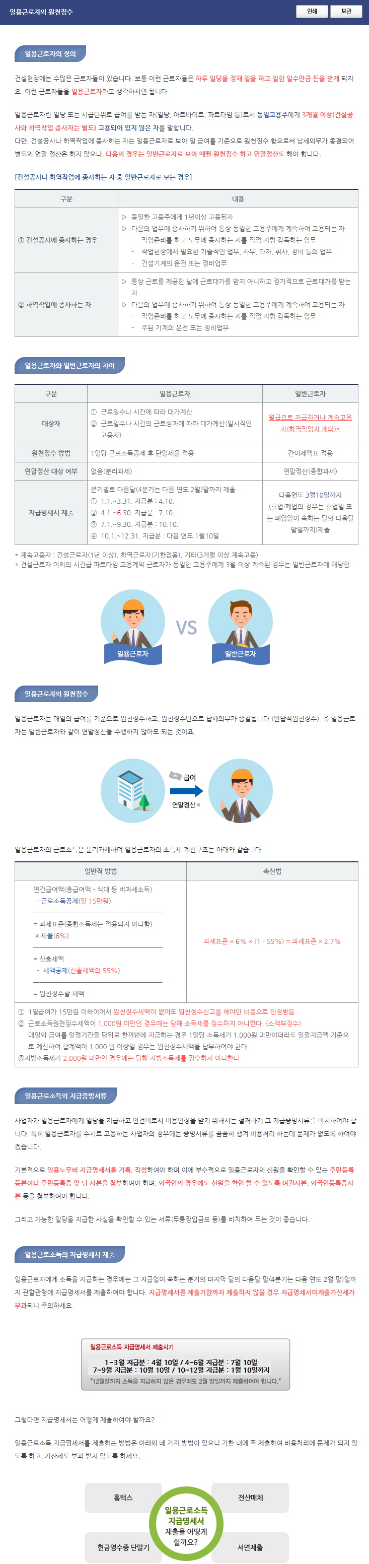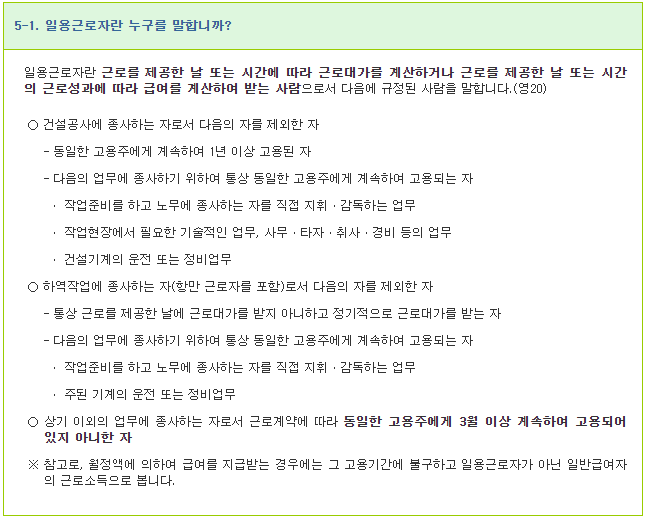 ※ 일용근로자에 해당하는 거주자가 3월 이상(건설공사종사자는 1년)계속하여 동일한 고용주에게 고용되는 경우에는 3월 이상이 되는 월부터 일반급여자로 보아 원천징수하고, 해당연도 1월 1일부터 12월 31일까지 지급받은 급여를 합산하여 연말정산 해야 한다.