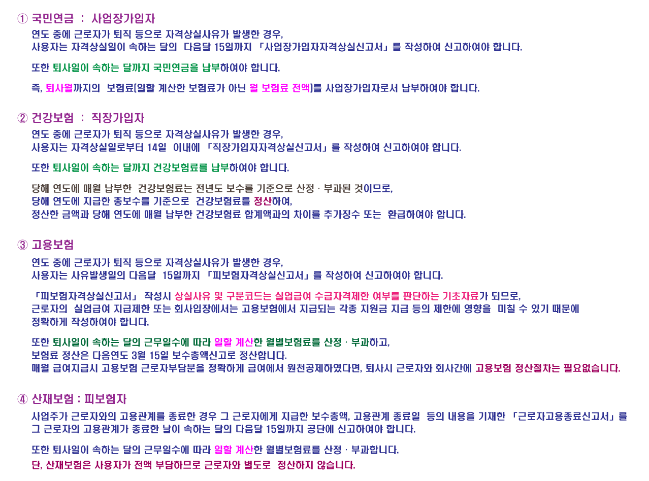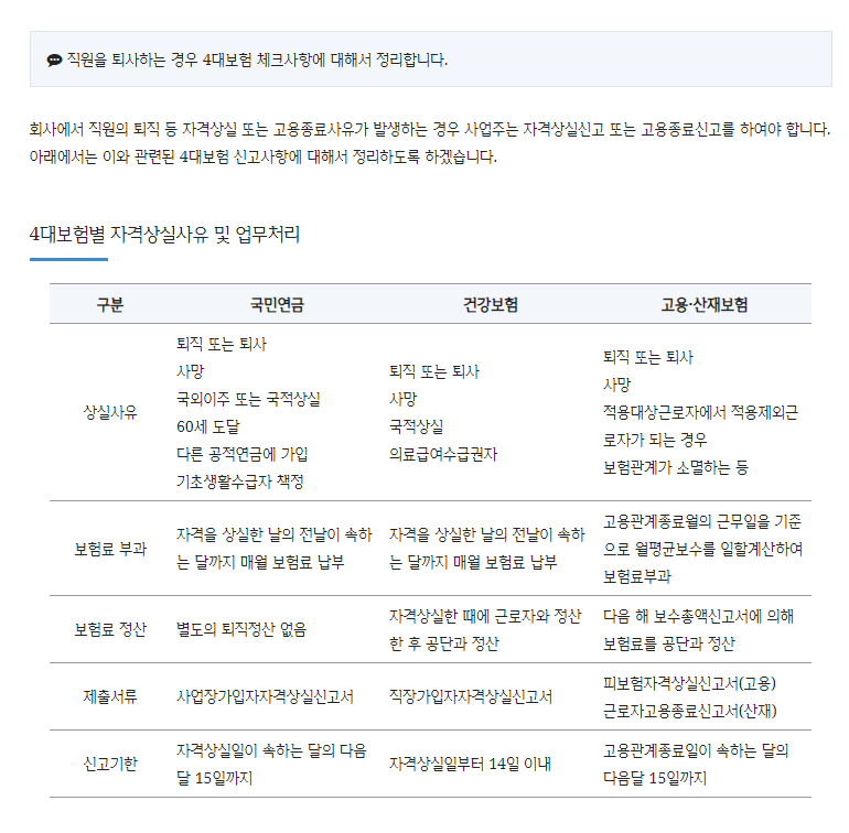 4대보험은 국민연금, 건강보험, 고용보험, 산재보험을 말한다. 4대보험 중 고용보험과 산재보험은 사업주와 근로관계를 맺은 근로자 신분일 때만 의무적으로 가입하는 보험이기 때문에 사업주가 자격상실신고를 하는 것으로 관계가 끝난다. 보험료 납부 의무도 없어진다.