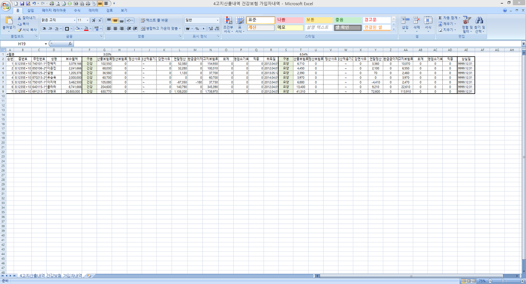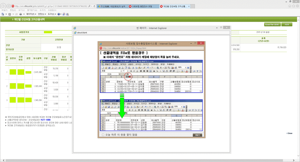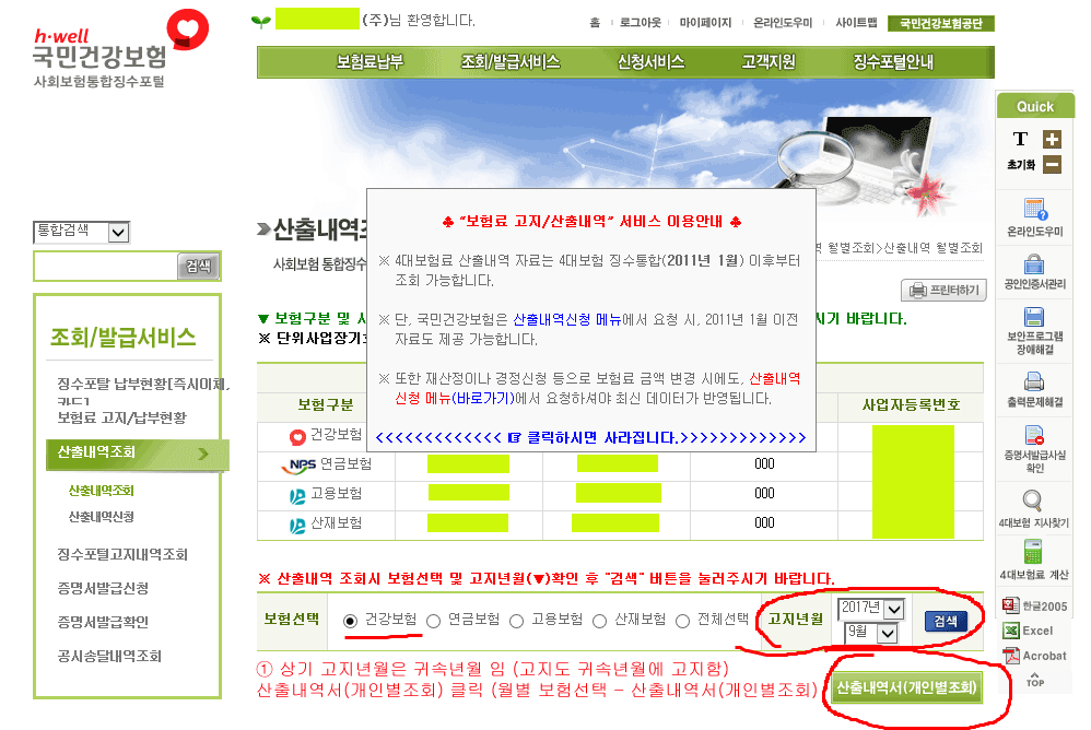 산출내역서(개인별조회) 클릭 하면 새창이 뜨면서 개인별 건강보험 고지산출내역서 윈도우가 뜬다.