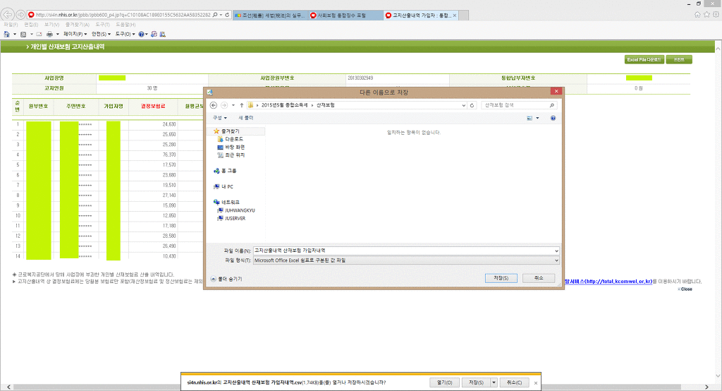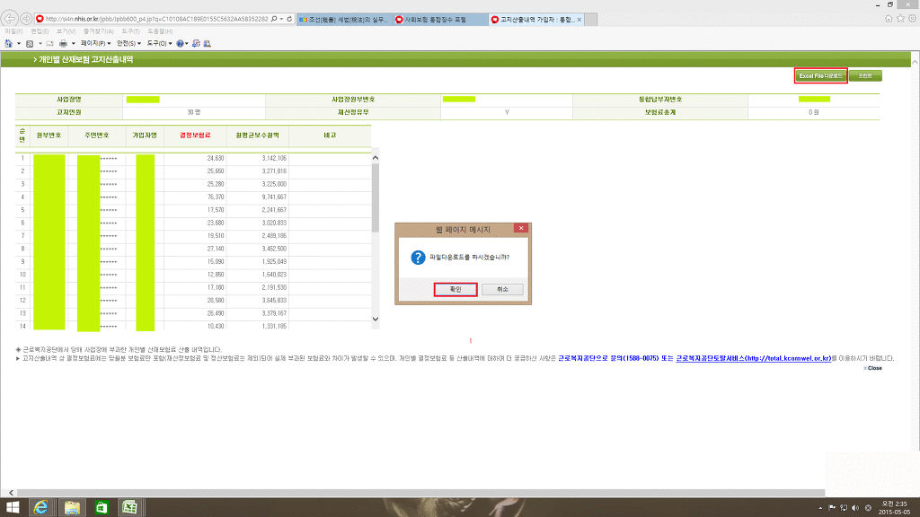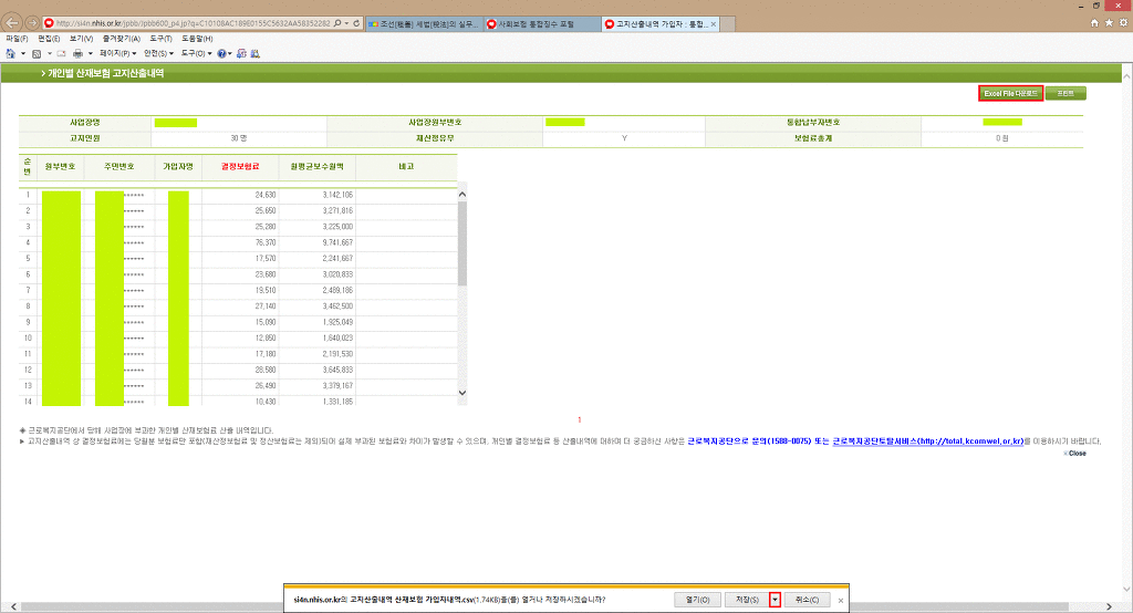 산출내역서(개인별조회) 클릭 하면 새창이 뜨면서 개인별 산재보험보험 고지산출내역서 윈도우가 뜬다.