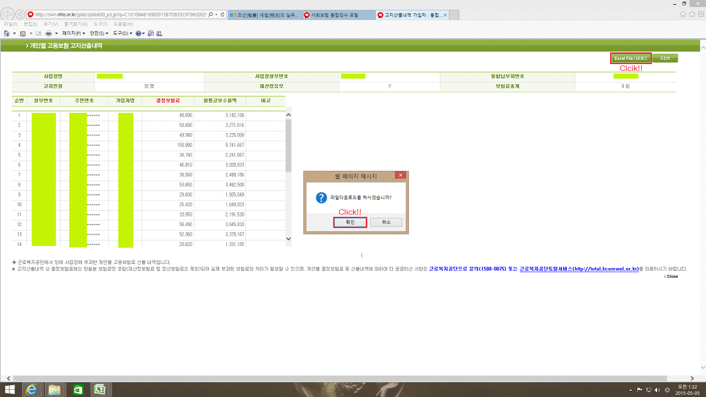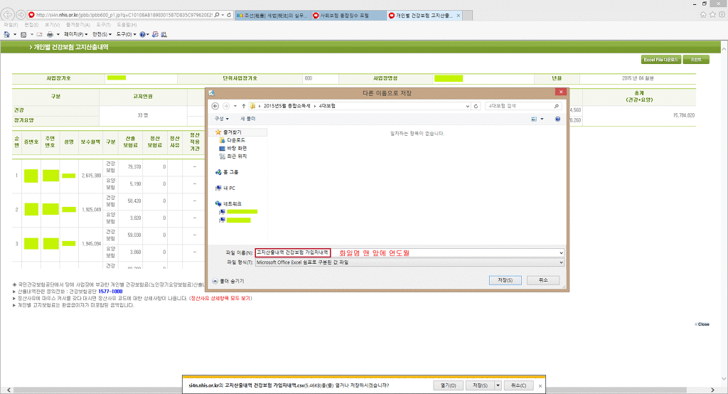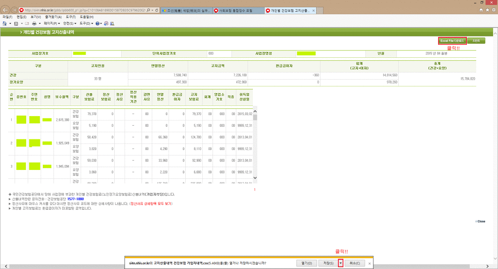 ⑤ ⊙건강보험선택후 2014년 12월 고지 선택 후 검색 클릭(엑셀화일 다운로드 후 각직원별로 회사부담,직원부담분이 별도로 금액이 구분되어 있으므로 직원부담분의 금액을 급여대장의 건강보험과 장기요양보험 공제액에 금액을 기재합니다.)