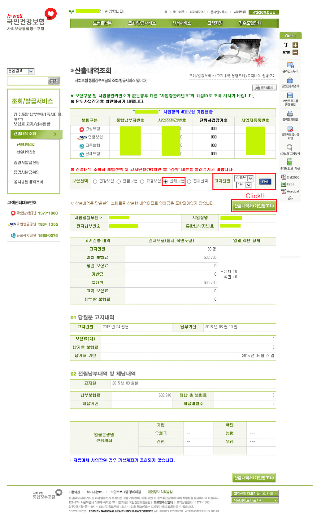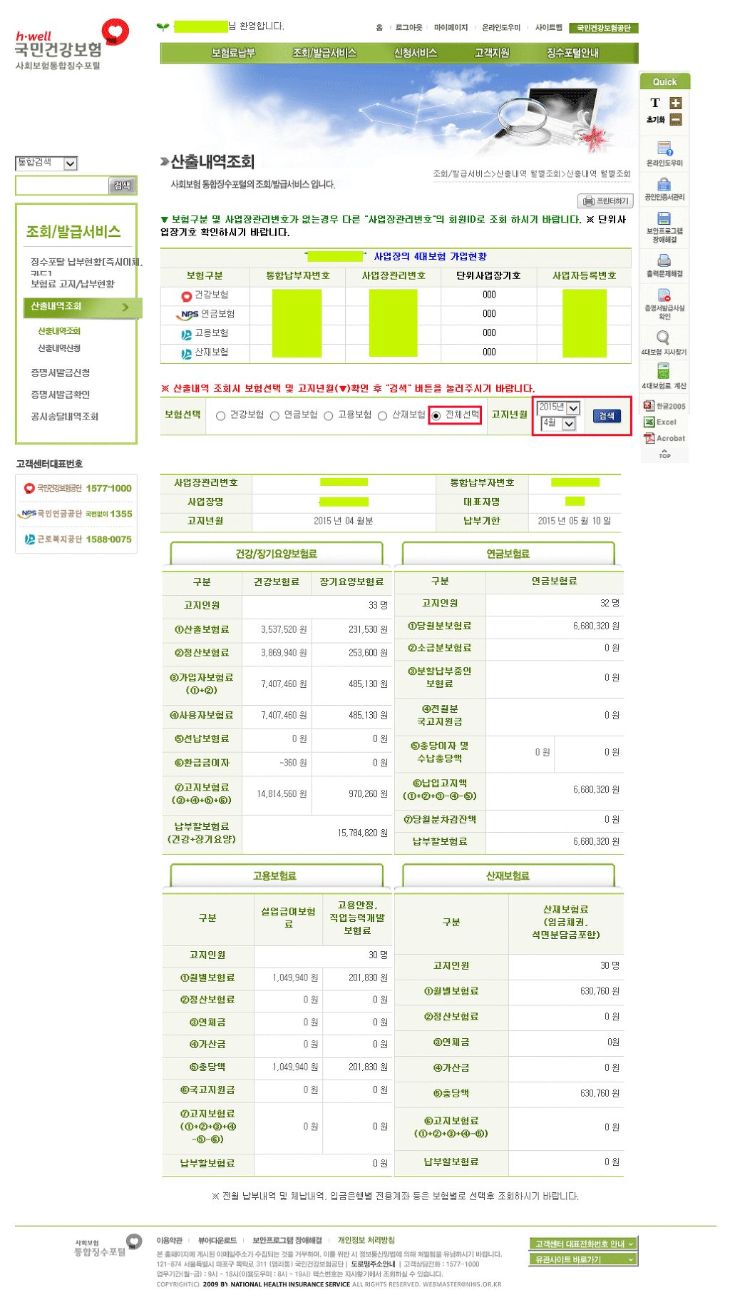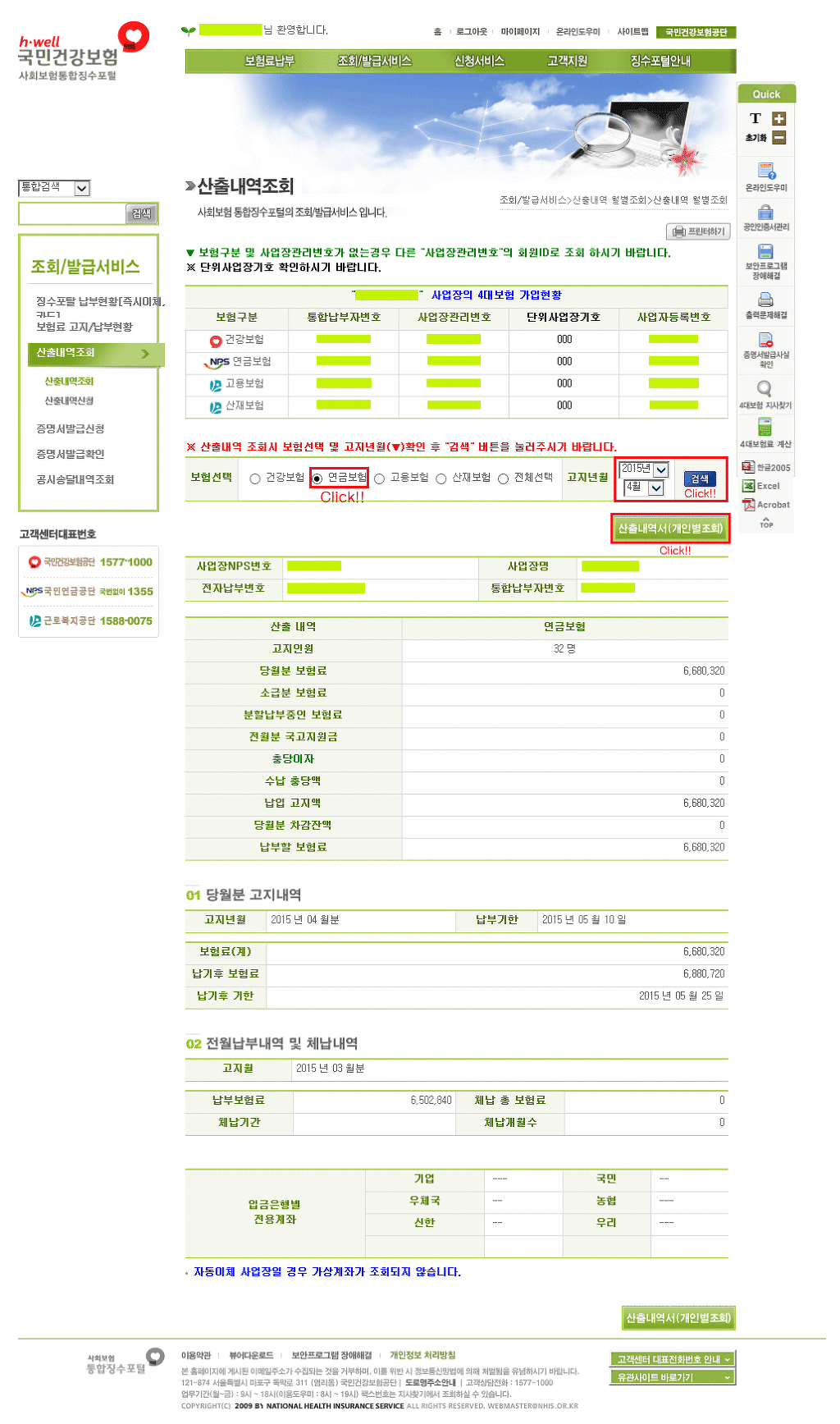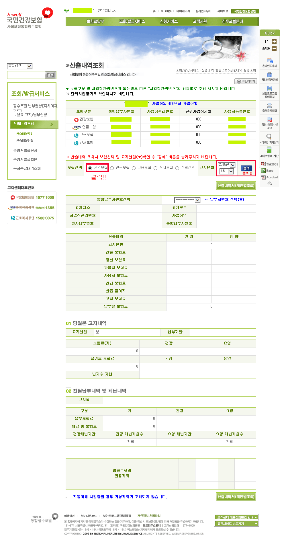 ※ 산출내역 조회시 보험선택 및 고지년월(▼)확인 후 "검색" 버튼을 눌러주시기 바랍니다.