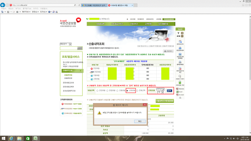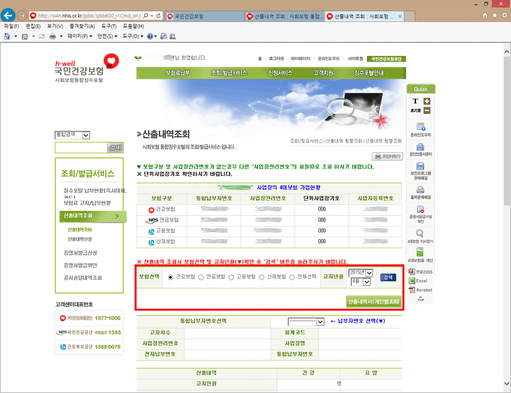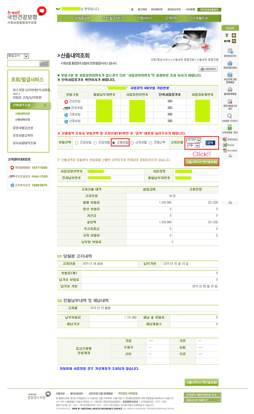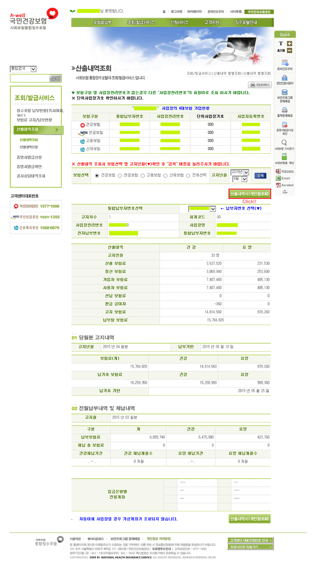 ※ 산출내역 조회시 보험선택 및 고지년월(▼)확인 후 "검색" 버튼을 눌러주시기 바랍니다.