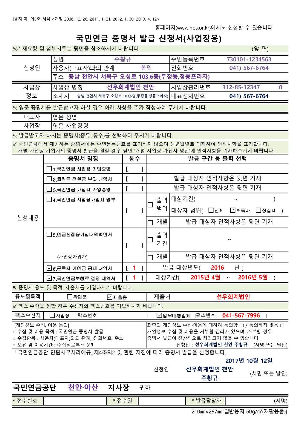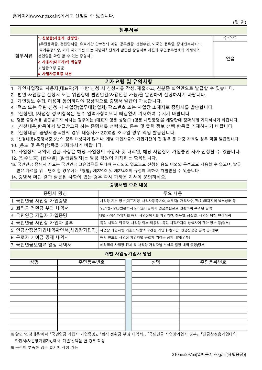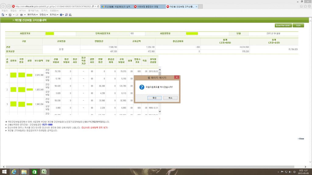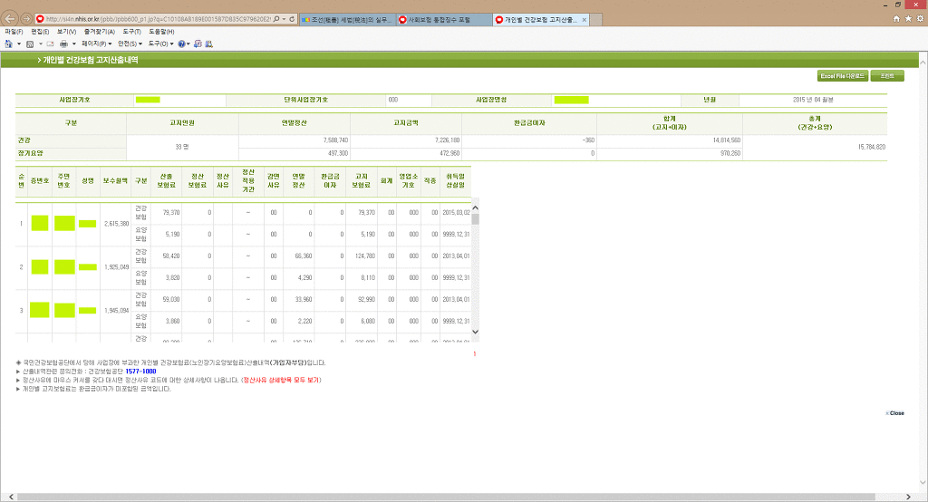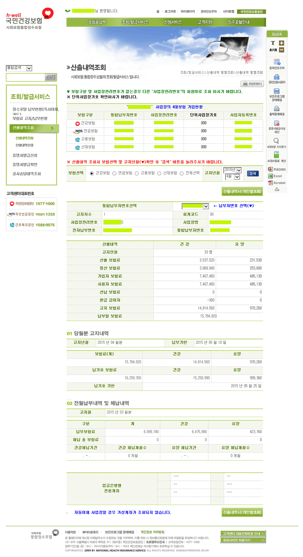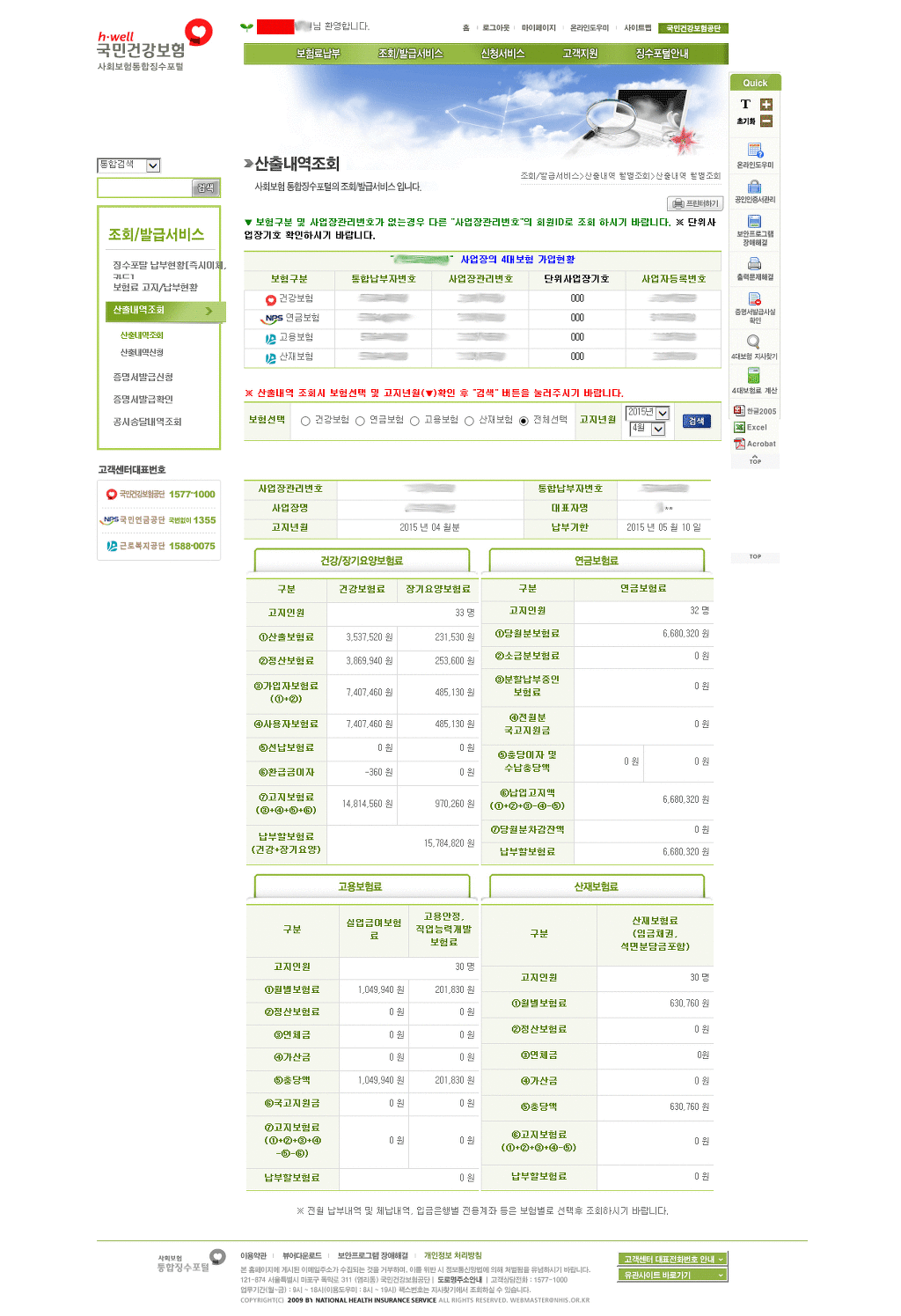 국민연금,건강보험은 고용주가 전화해서 개인별산출내역서 요청하여 팩스수신 가능