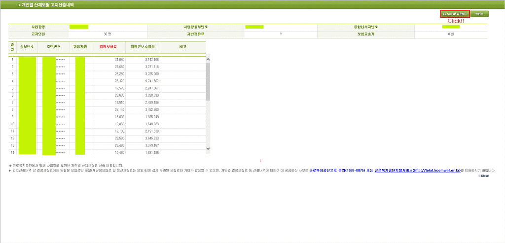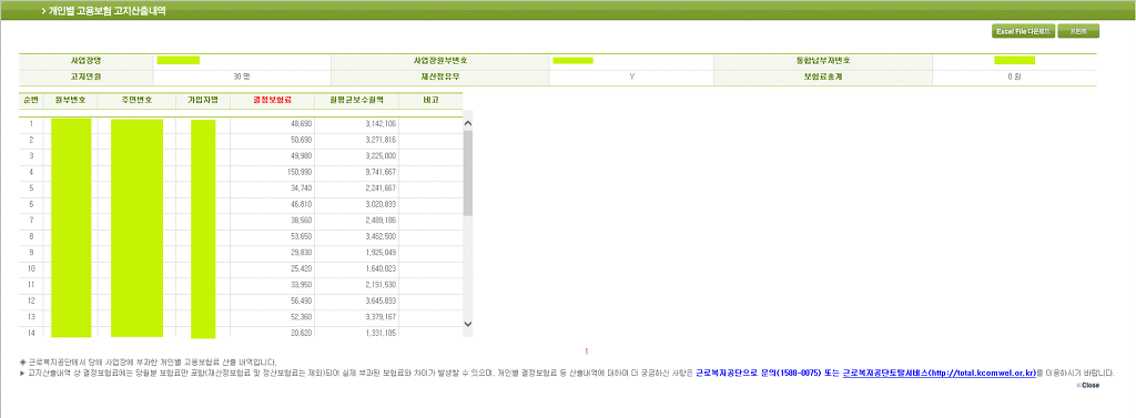 ◈ 근로복지공단에서 당해 사업장에 부과한 개인별 산재보험료 산출 내역입니다.