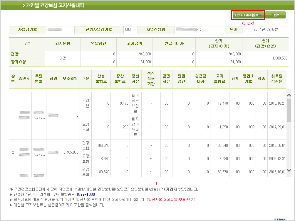 ◈ 국민건강보험공단에서 당해 사업장에 부과한 개인별 건강보험료(노인장기요양보험료)산출내역(가입자부담)입니다.