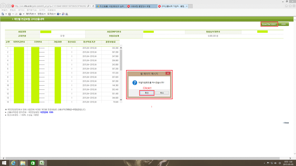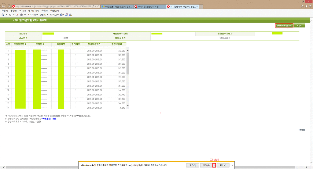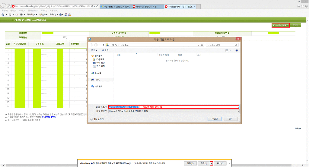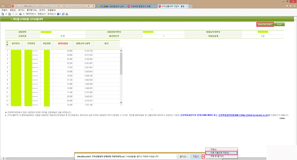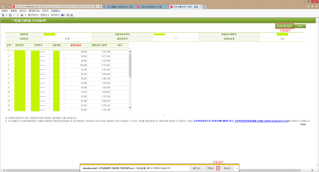 산출내역(개인별조회) 클릭 후 Excel File 다운로드 후 세무대린에게 전송