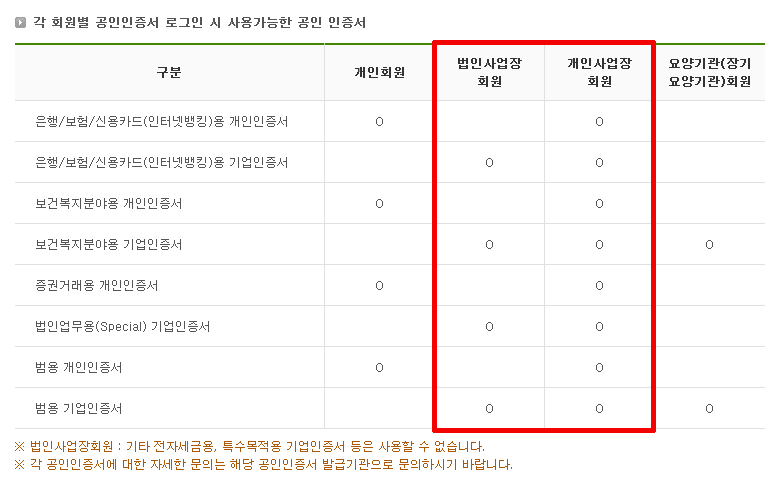 - 사업장 대표자 명의 회원은 개인인증서만 등록가능합니다.