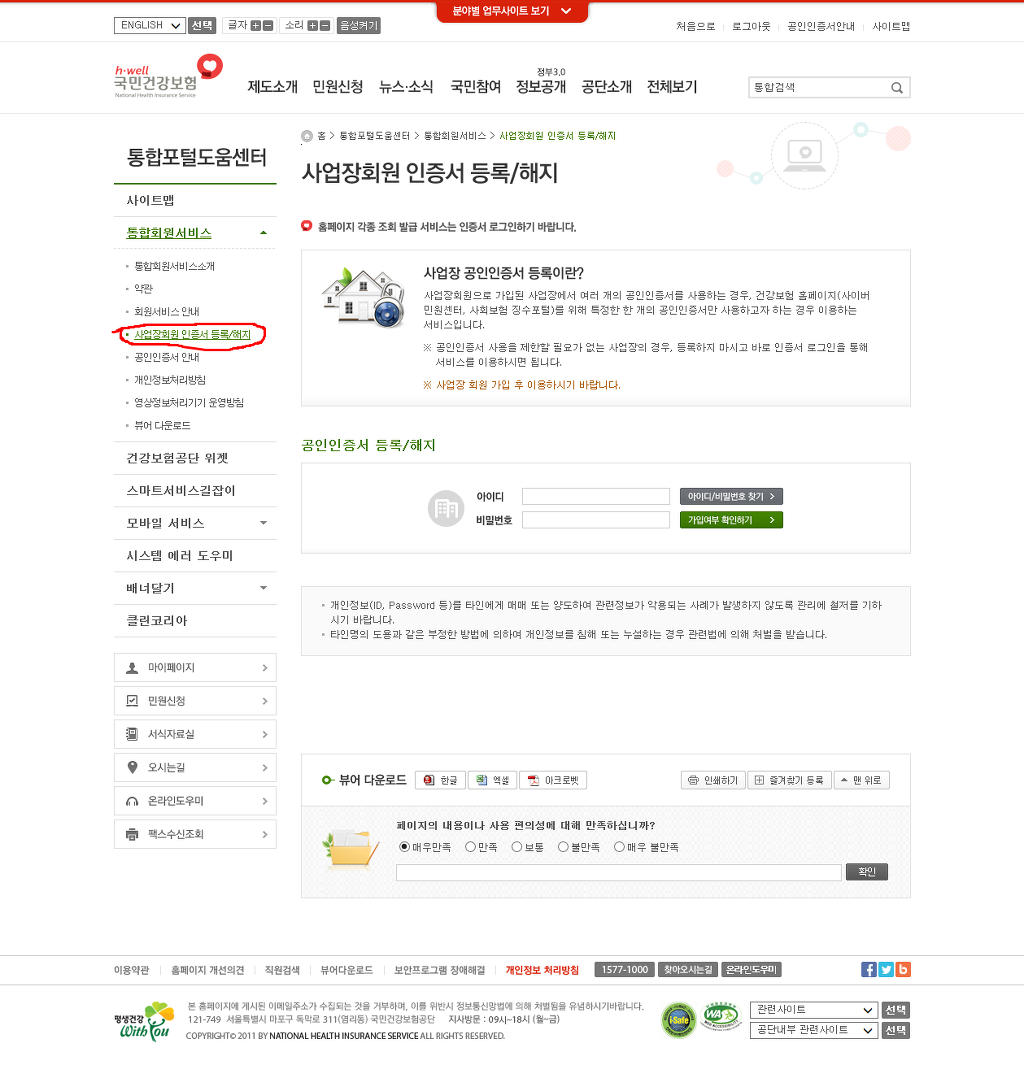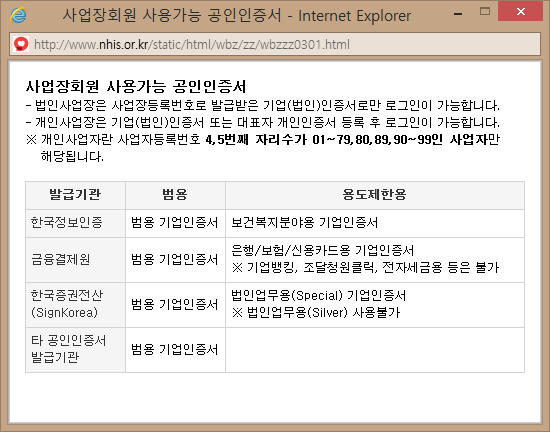 - 사업장 대표자 명의 회원이 사업장(의료기관)인증서를 이용하기 위해서는 회원가입-사업장-사업장명의 공인인증서 인증을 선택하고 다시 회원가입 후 이용가능합니다.