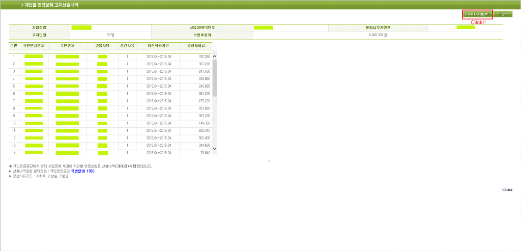 ◈ 국민연금공단에서 당해 사업장에 부과한 개인별 연금보험료 산출내역(기여금+부담금) 입니다.