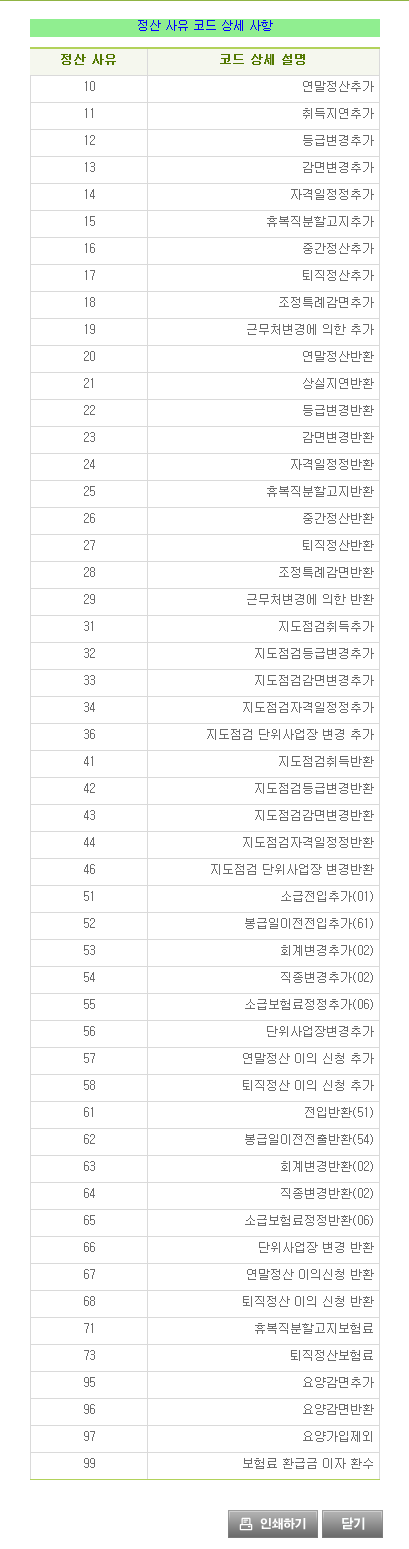 ▶ 정산사유에 마우스 커서를 갖다 대시면 정산사유 코드에 대한 상세사항이 나옵니다. (정산사유 상세항목 모두 보기)
