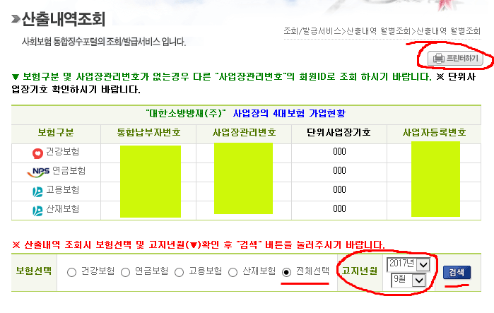 ① 전체선택 - 고지년월 (=> 실제고지연원이 아닌 고지년월은 귀속월분 임) 검색 클릭 - 프린터하기