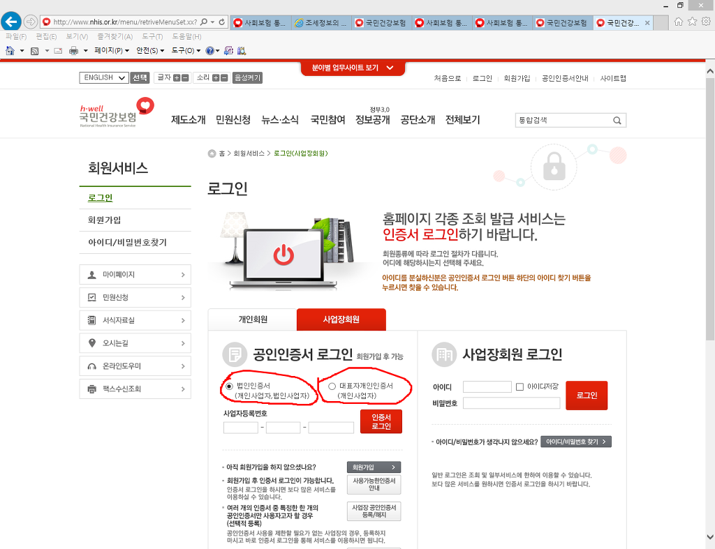 - 법인사업장은 사업장등록번호로 발급받은 기업(법인)인증서로만 로그인이 가능합니다.