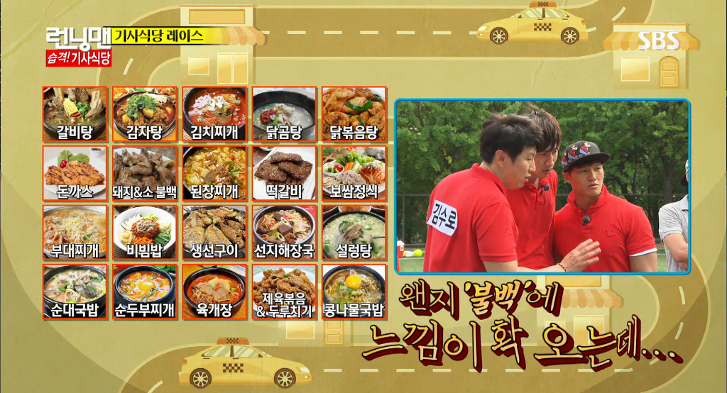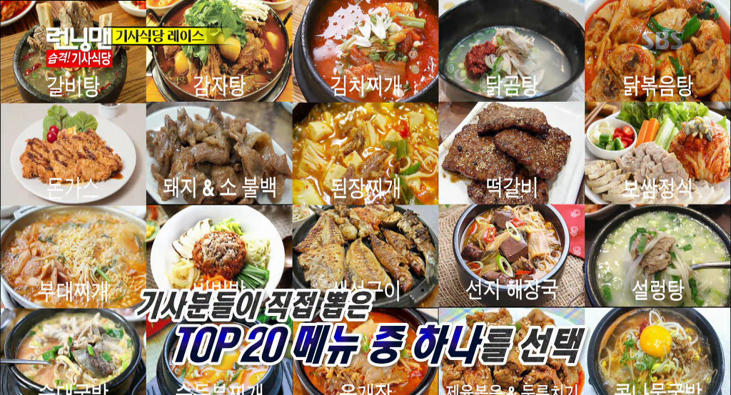 부대찌개 , 비빔밥 , 생선구이, 선지 해장국 , 설렁탕 , 순대국밥 , 순두부찌개 , 육개장 , 제육볶음 & 두루치기 , 콩나물국밥