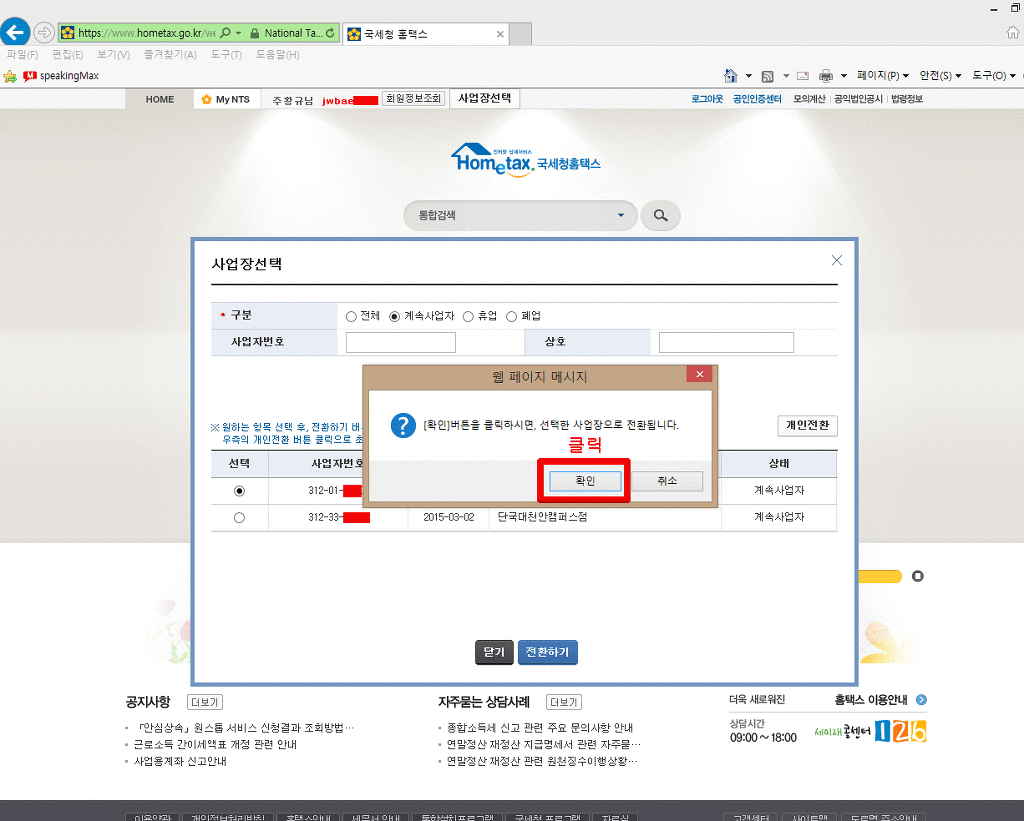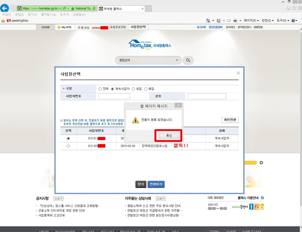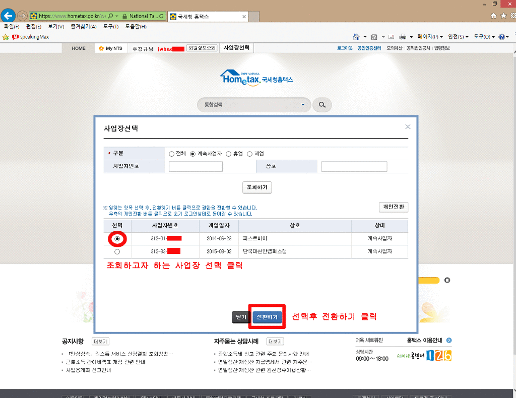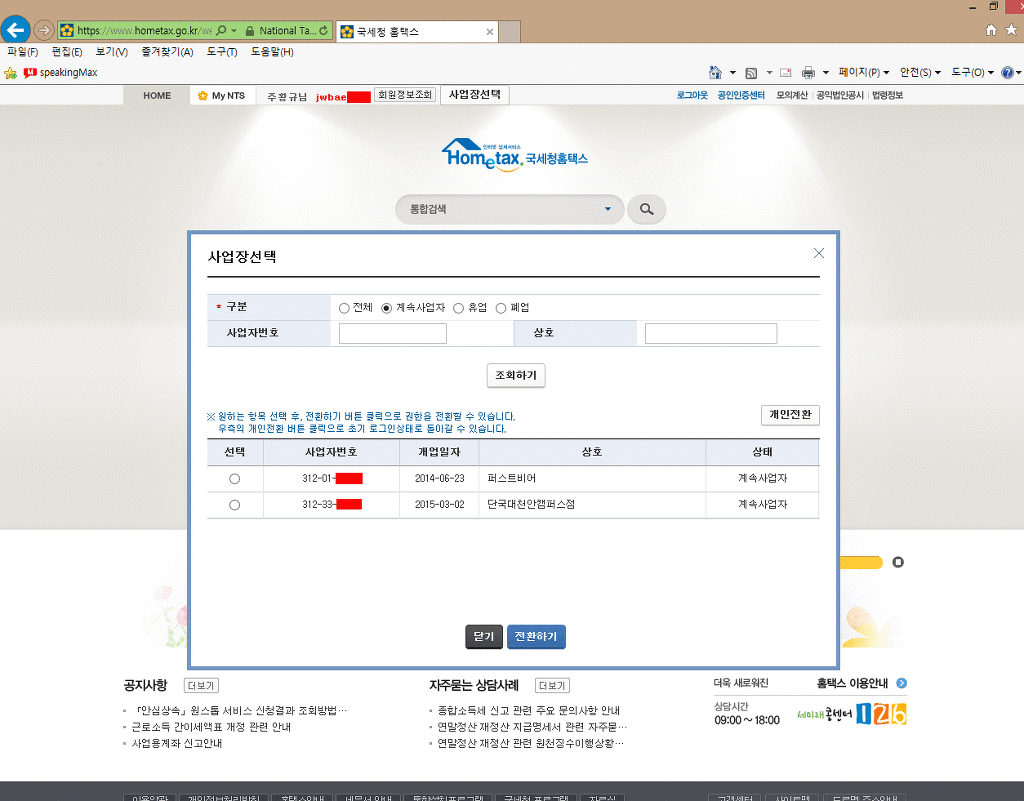 홈택스 개인사업자 사업장이 2개이상일경우 사업장 전환방법 작성자주황규 팀장|작성시간15.07.16|조회수1,590 목록 댓글 0 글자크기 작게가 글자크기 크게가 다음검색 현재 게시글 추가 기능 열기 북마크 공유하기 신고 센터로 신고 댓글 댓글 0 댓글쓰기 답글쓰기 댓글 리스트