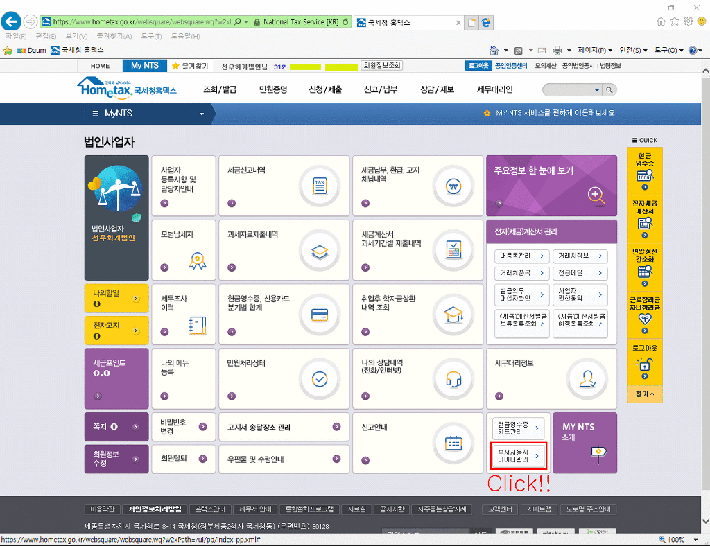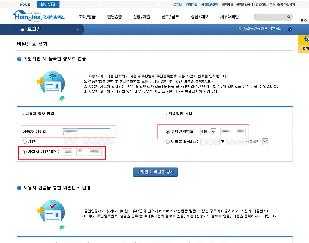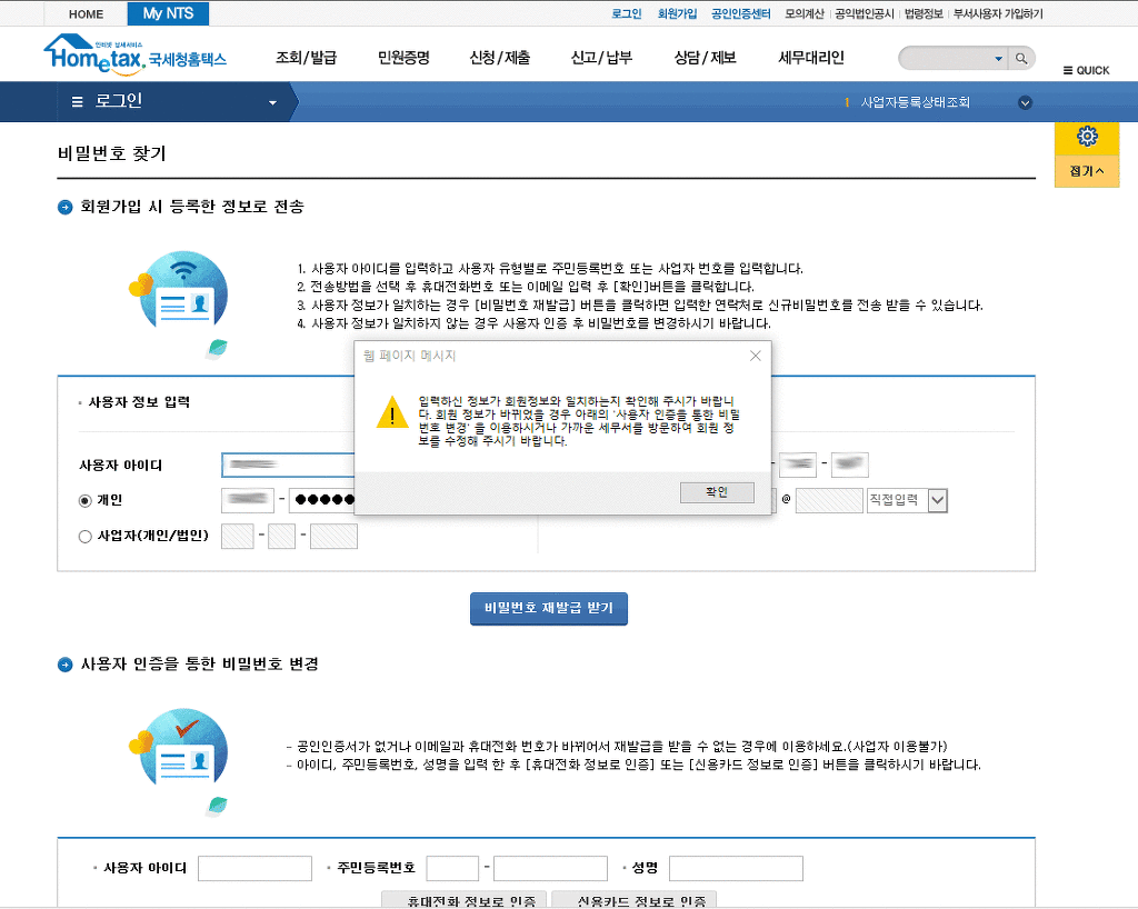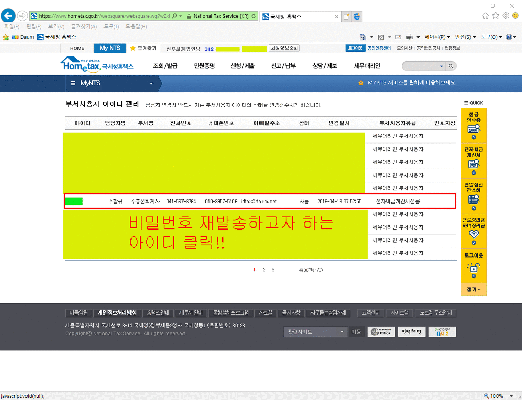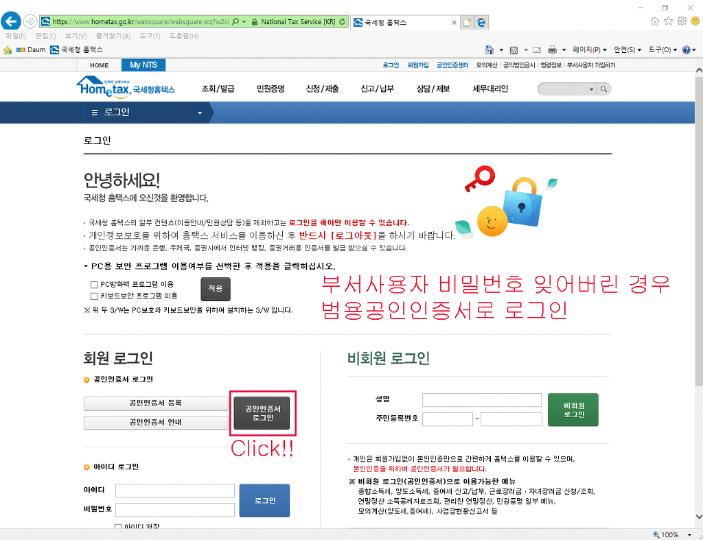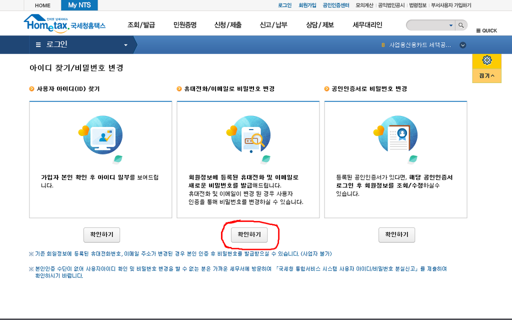 세무대리인 홈택스 부서사용자 아이디 비밀번호를 잊어버린 경우 , 홈택스 비밀번호 찾기 작성자EYEDI|작성시간17.06.08|조회수2,870 목록 댓글 0 글자크기 작게가 글자크기 크게가 ============================================================================================== 다음검색 현재 게시글 추가 기능 열기 북마크 공유하기 신고 센터로 신고 댓글 댓글 0 댓글쓰기 답글쓰기 댓글 리스트