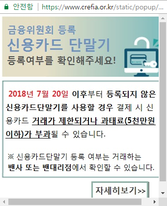 3 - 가맹점 매출거래정보 통합조회시스템 ( 신용카드매출내역 조회 ) 작성자EYEDI|작성시간17.12.15|조회수1,693 목록 댓글 0 글자크기 작게가 글자크기 크게가 여신금융협회 운영, 일별 승인, 매입, 입금 내역, 실적 조회 서비스 제공.www.cardsales.or.kr/로그인 후 오른쪽 상단에 마이페이지 클릭하면 가맹점 수수료율/대금지급주기 과 각 카드사 가맹점번호가 나옴. 다음검색 현재 게시글 추가 기능 열기 북마크 공유하기 신고 센터로 신고 댓글 댓글 0 댓글쓰기 답글쓰기 댓글 리스트