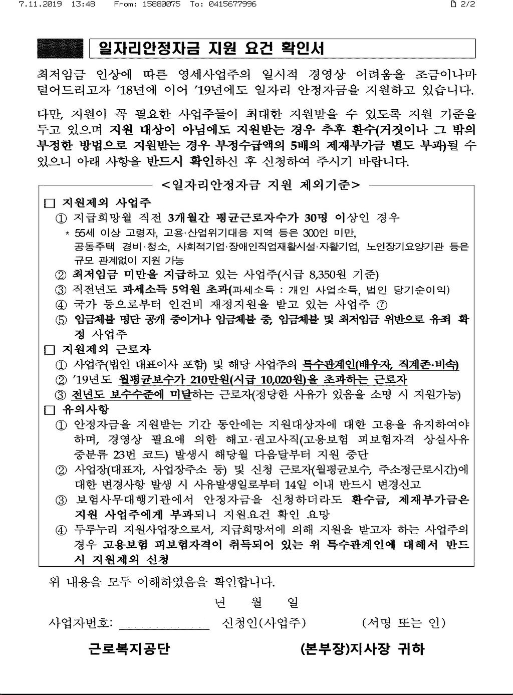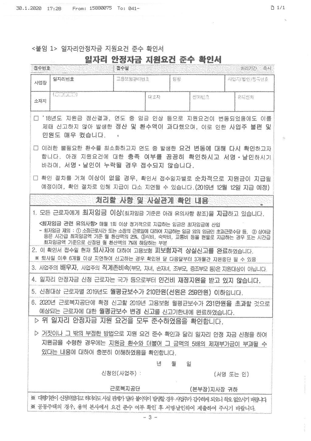 □ ’18년도 지원금 정산결과, 연도 중 임금 인상 등으로 지원요건이 변동되었음에도 이를 제때 신고하지 않아 발생한 정산 및 환수액이 과다했으며, 이로 인한 사업주 불편 및 민원도 매우 컸습니다. □ 이러한 불필요한 환수를 최소화하고자 연도 중 발생한 요건 변동에 대해 다시 확인하고자 합니다. 아래 지원요건에 대한 충족 여부를 꼼꼼히 확인하시고 서명ㆍ날인하시기 바라며, 서명ㆍ날인이 누락될 경우 접수되지 않습니다. □ 확인 절차를 거쳐 이상이 없을 경우, 확인서 접수일자별로 순차적으로 지원금이 지급될 예정이며, 확인 절차로 인해 지급이 다소 지연될 수 있습니다.(2019년 12월 12일 지급 예정) | ||||||||||||