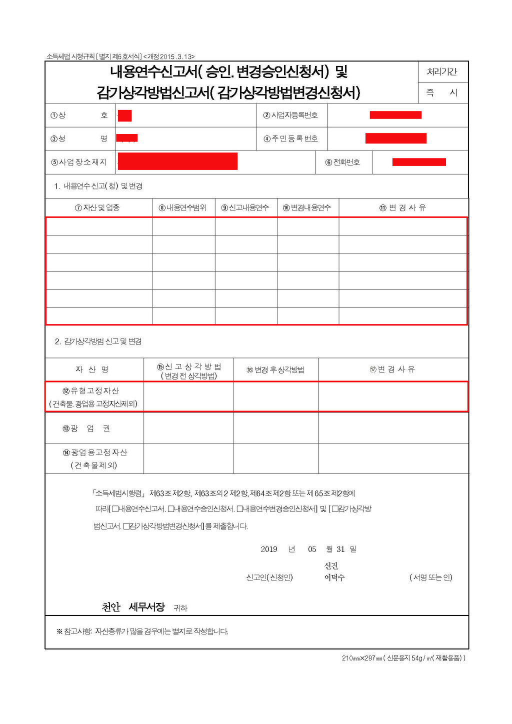 ② 제1항에 따른 승인을 받으려는 사업자는 그 변경할 상각방법을 적용하려는 최초 과세기간의 종료일까지 기획재정부령으로 정하는 감가상각방법변경신청서를 납세지 관할세무서장에게 제출(국세정보통신망에 의한 제출을 포함한다)하여야 한다.(2015.02.03 개정)