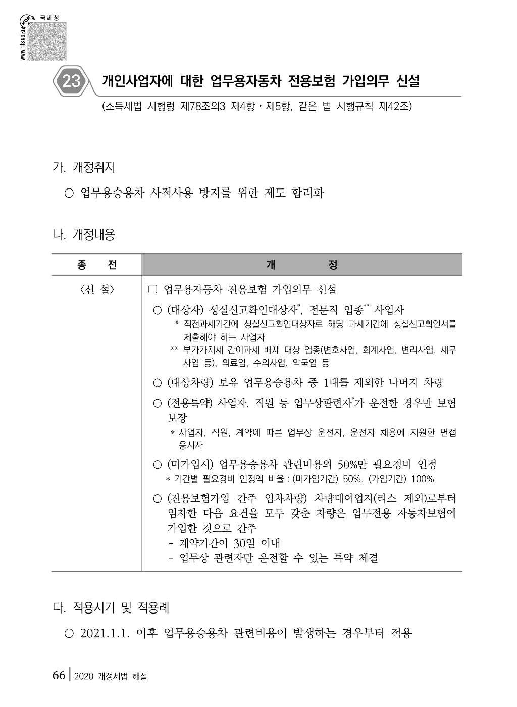 (12) 개인사업자에 대한 업무용자동차 전용보험 가입의무 신설(소득령 §78의3④)