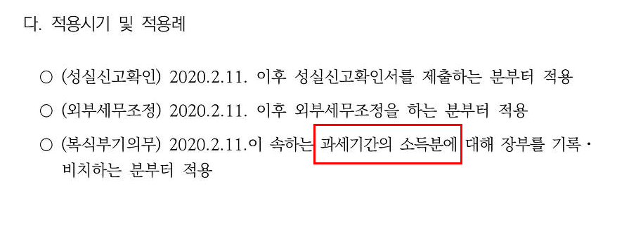 | 제22조 【복식부기대상자 범위에 관한 적용례】 제208조[ 장부의 비치·기록] 제5항 제2호 각 목 외의 부분 본문의 개정규정은 이 영 시행일이 속하는 과세기간의 소득분에 대해 장부를 기록하거나 비치하는 경우부터 적용한다. -> 2020년 귀속부터 |