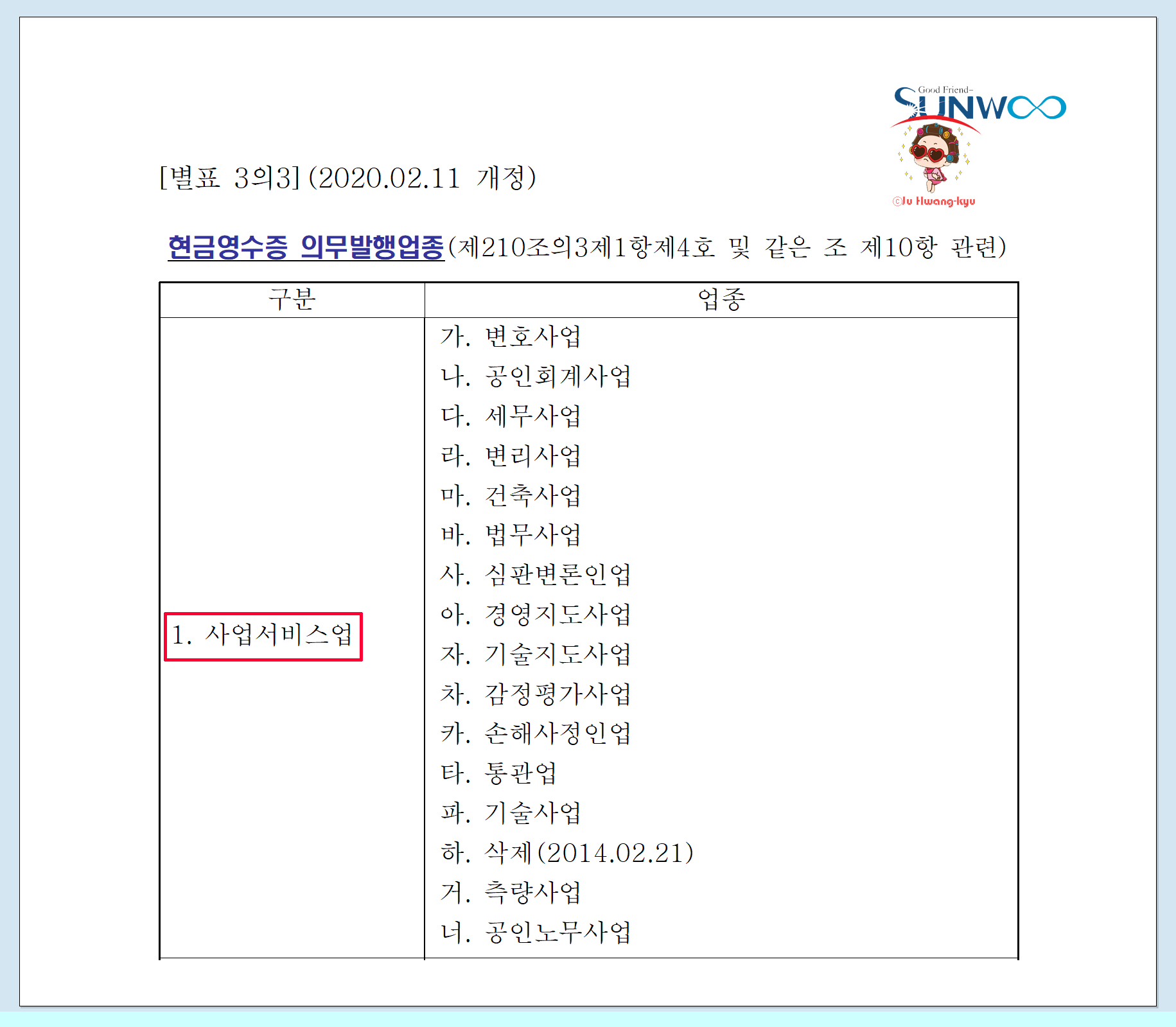 다만, 제1호 또는 제2호에 해당하는 업종을 영위하는 사업자 중 별표 3의3[현금영수증 의무발행업종]에 따른 사업서비스업을 영위하는 사업자의 경우에는 제3호에 따른 금액 이상인 사업자를 말한다.(2020.02.11 개정)