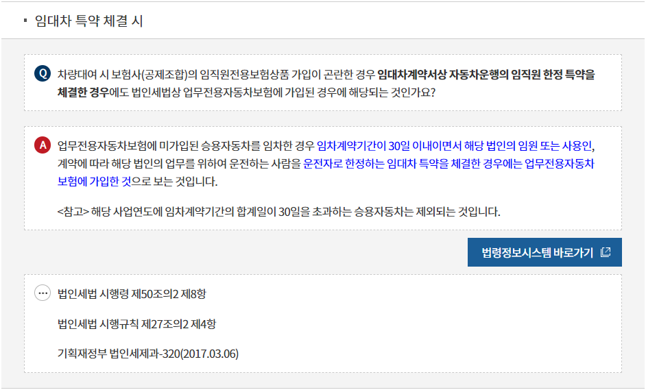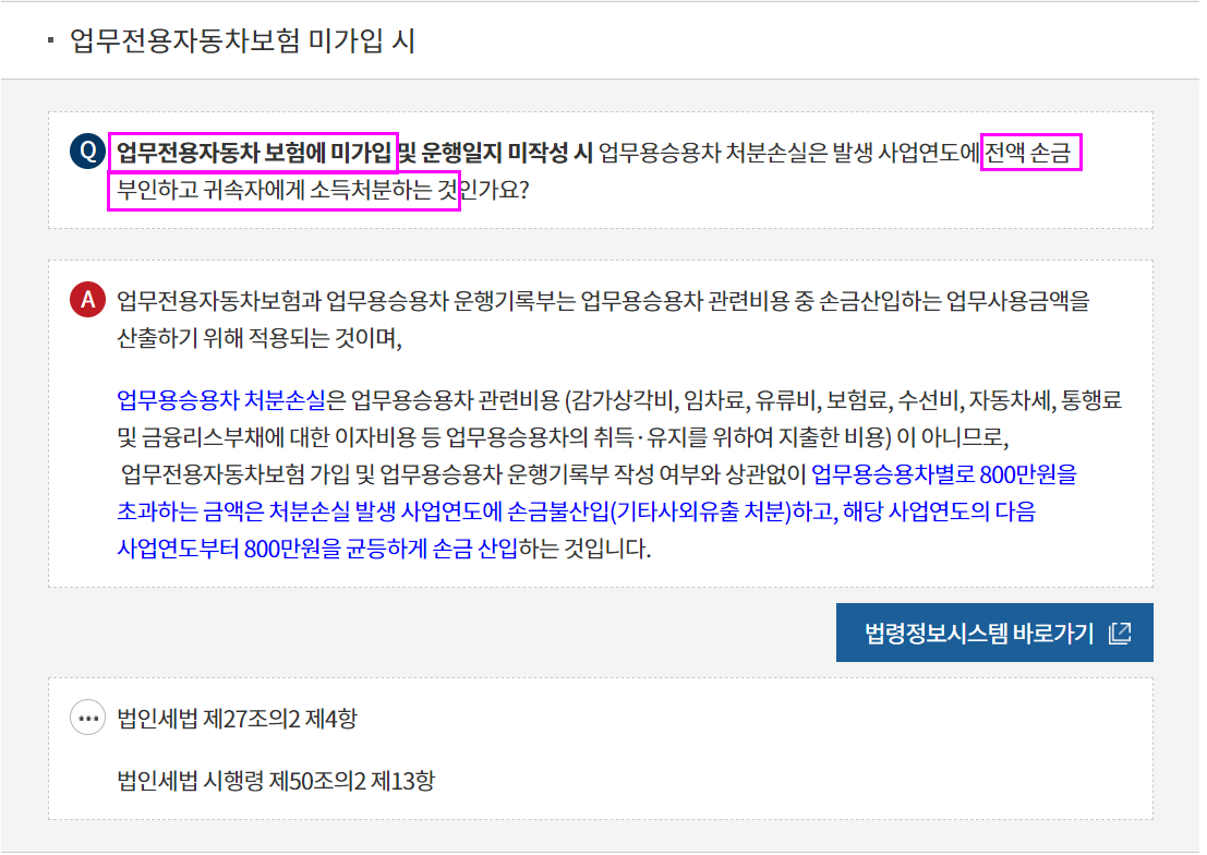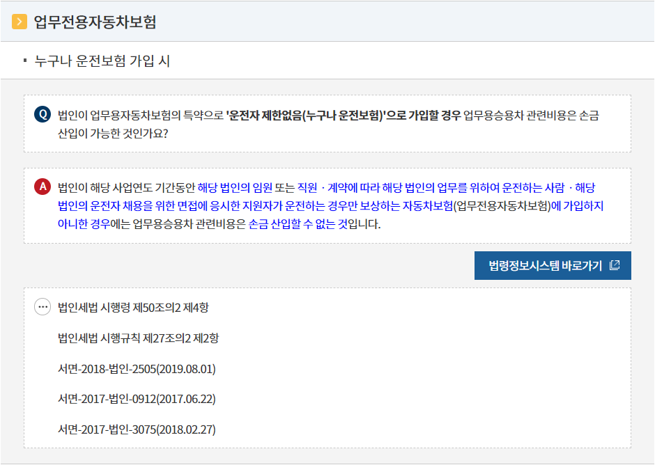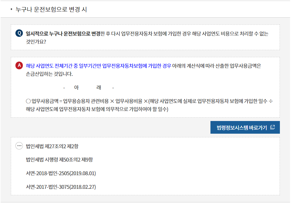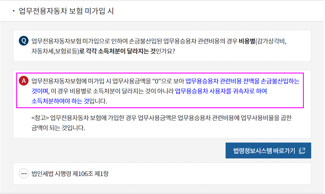 업무전용자동차보험 (임직원전용특약) 미가입 시 -> 업무용승용차 관련비용 전액 손금불산입 및 전액 사용자 (인정)상여 처분 작성자주황규|작성시간21.03.31|조회수1,324 목록 댓글 0 글자크기 작게가 글자크기 크게가 아무나 누구나 아무 https://www.youtube.com/watch?v=fZ1ESSUUYf8나보험 누구나보험 업무전용보험 업무용승용차보험 다음검색 현재 게시글 추가 기능 열기 북마크 공유하기 신고 센터로 신고 댓글 댓글 0 댓글쓰기 답글쓰기 댓글 리스트