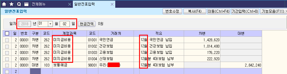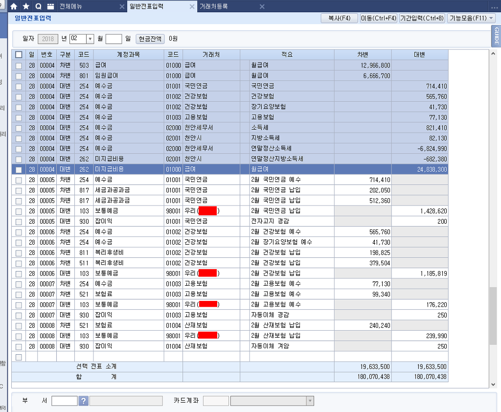 2월분 3월10일 지급 급여대장을 2.28일 급여분개 중 하단