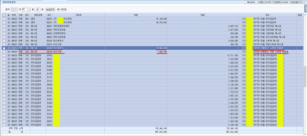 대변 예수금 9,583,580 거래처 아산세무서