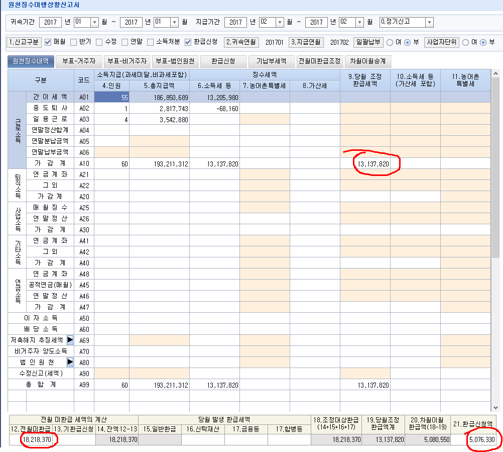 구분                인원   총지급액                   소득세등                    차월이월환급액