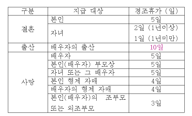 ② 제1항에 따른 경조사 휴가기간 중 휴일 또는 휴무일이 포함되어 있는 경우에는 이를 포함하여 휴가기간을 계산한다