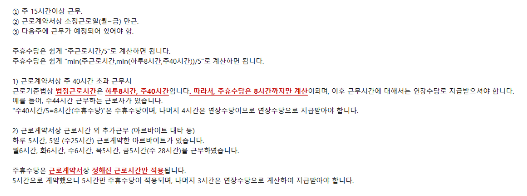 : 주 40시간 비례해서 주휴시간 계산 (일주소정근로시간 / 5)
