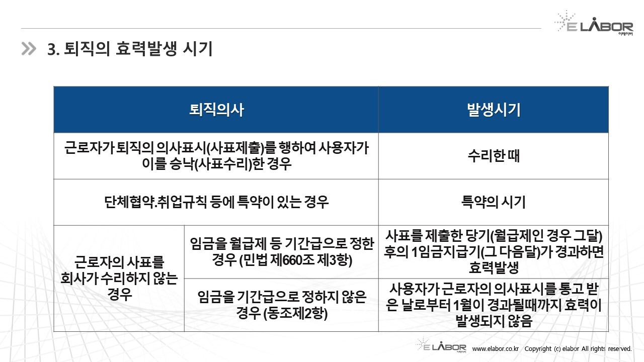 ① 근로자가 사표를 제출하여 임의로 퇴직할 때에는 원칙적으로 사표수리일이 퇴직일이 됩니다.