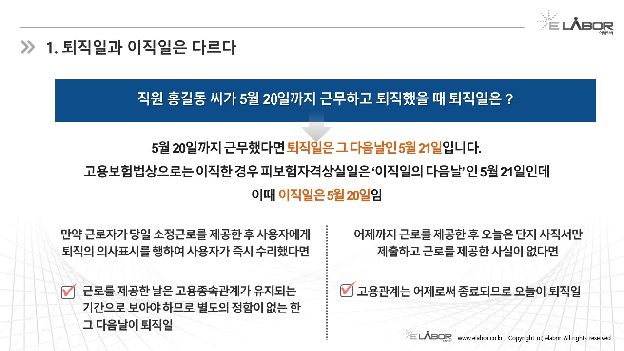 퇴직일입니다. 직장인들은 그만 둔 날(이직일)을 퇴직일로 잘못 아는 경우가 많습니다. 앞서 언급했듯이 근로를 제공한 날은 고용관계가 유지된 날입니다. 따라서 퇴직일은 고용관계가 종료되는 날, 즉 마지막으로 일을 한 다음날이 됩니다.