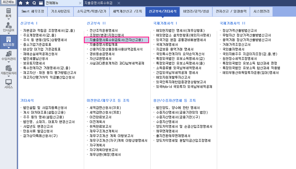 더존에서 법인세 전자신고시 메뉴는 지출증빙서류검토표를 작성해야 함.