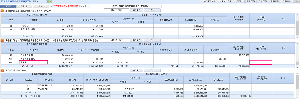 ※ 주의 : 지출증명서류합계표 상 085.접대비 21.차이금액과 세무조정계산서의 접대비등조정명세서의